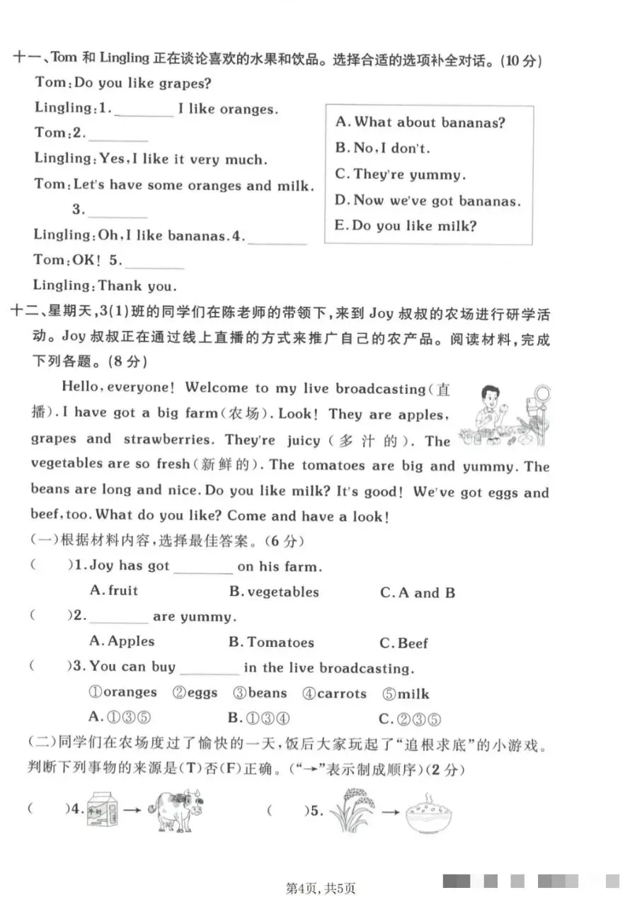 四、提示:在 tomatoes、bananas、grapes 和 strawberries 前的方框内画“√”。圈 B。