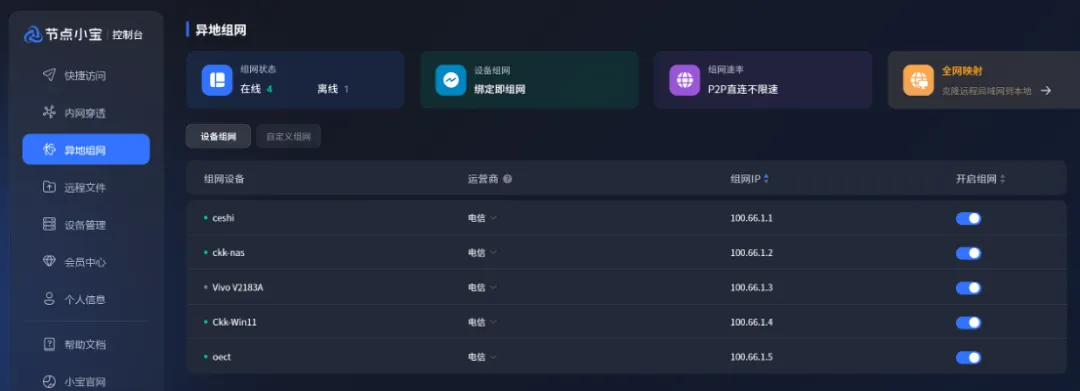 2. 创建虚拟网络:登录后,节点小宝自动建加密虚拟局域网,每台设备会获得专属虚拟IP,不用记乱七八糟的地址。