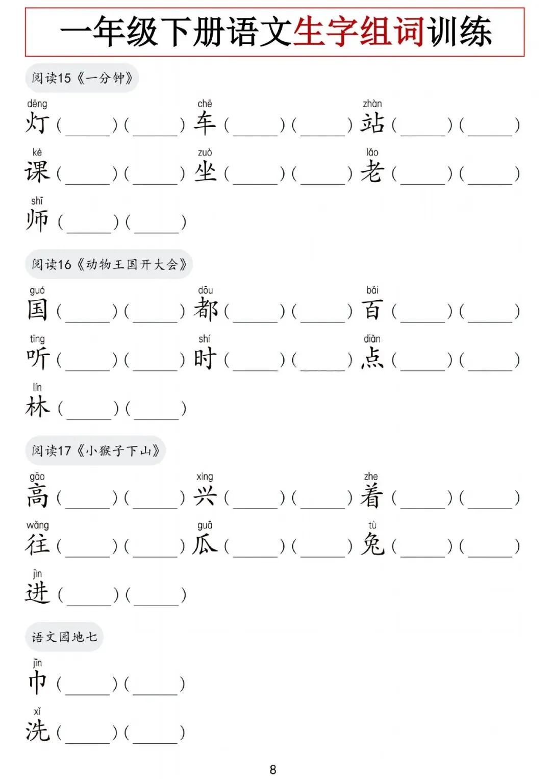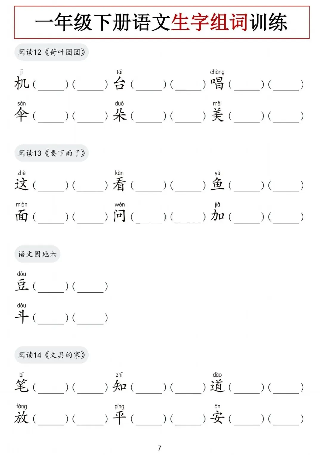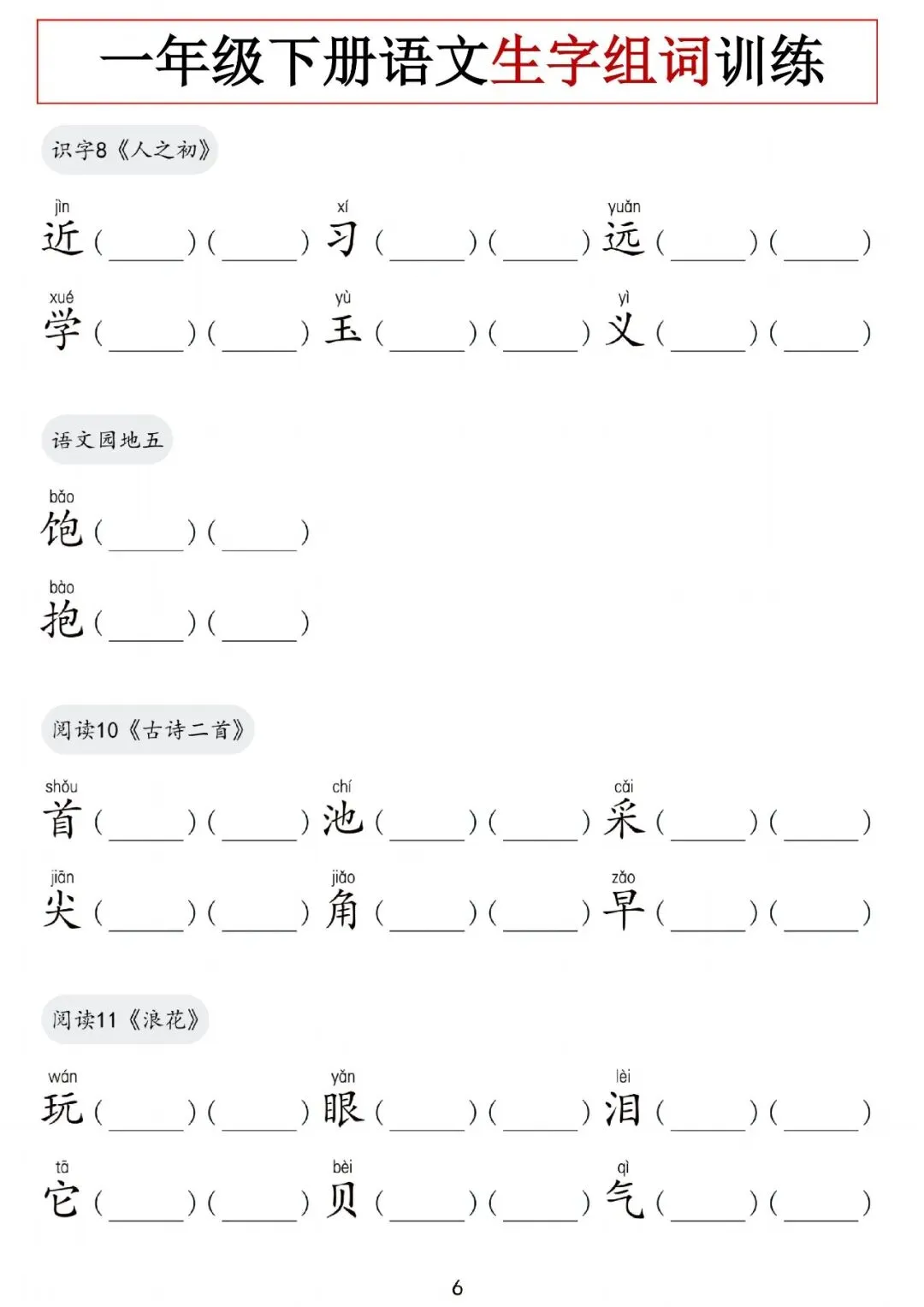 大家好,这里是淘学学资料库,这份《一年级下册语文生字组词训练》,完整 pdf 电子档共 9 页。这份资料同步一年级下册语文课本,按课文和单元顺序整理全部生字,每个生字都配有常用组词练习,覆盖春夏秋冬、姓氏歌、小青蛙、猜字谜等全册内容,题型简洁直观,孩子可以边写生字边记词语,帮助巩固识字、积累词汇,夯实语文基础。这份资料紧扣课本生字表,一课一练、循序渐进,把每课需要掌握的生字和组词集中呈现,方便孩子随堂练习、课后复习和考前巩固,既能加深对生字的理解记忆,又能丰富词汇量、提升组词能力,内容全面不重复,练习针对性强,是一年级孩子巩固生字、打好语文基础的实用训练资料。