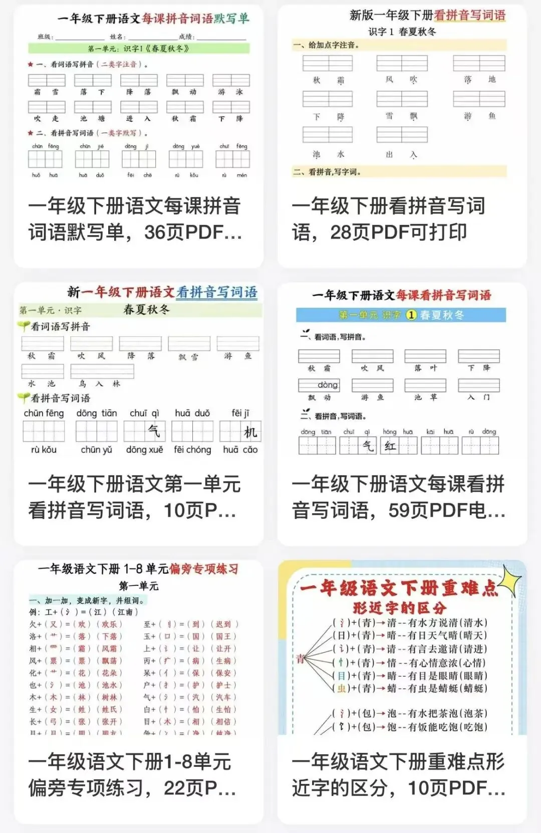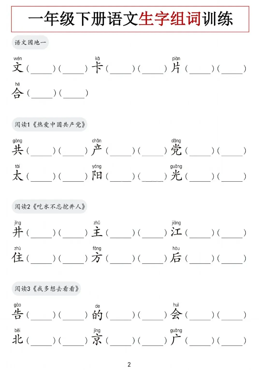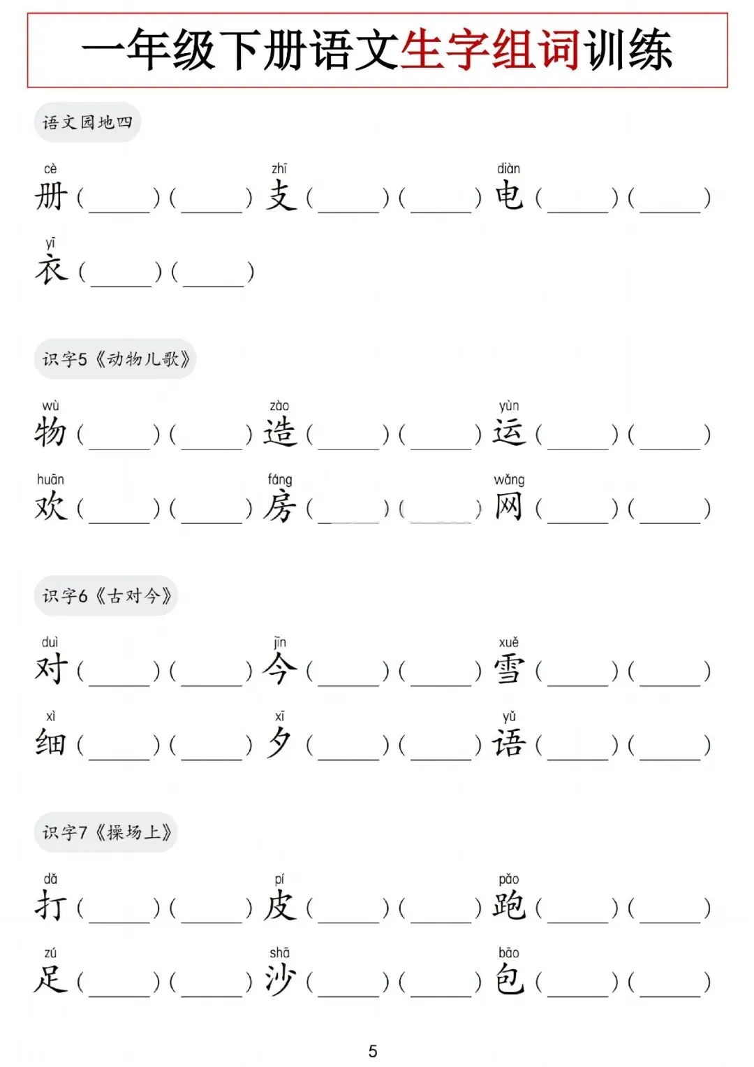 大家好,这里是淘学学资料库,这份《一年级下册语文生字组词训练》,完整 pdf 电子档共 9 页。这份资料同步一年级下册语文课本,按课文和单元顺序整理全部生字,每个生字都配有常用组词练习,覆盖春夏秋冬、姓氏歌、小青蛙、猜字谜等全册内容,题型简洁直观,孩子可以边写生字边记词语,帮助巩固识字、积累词汇,夯实语文基础。这份资料紧扣课本生字表,一课一练、循序渐进,把每课需要掌握的生字和组词集中呈现,方便孩子随堂练习、课后复习和考前巩固,既能加深对生字的理解记忆,又能丰富词汇量、提升组词能力,内容全面不重复,练习针对性强,是一年级孩子巩固生字、打好语文基础的实用训练资料。