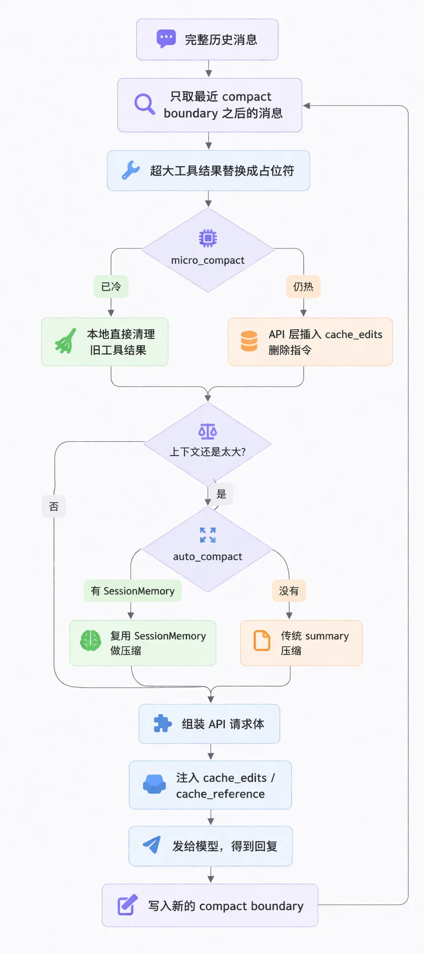 SessionMemory(如果有的话):后台持续维护的结构化笔记,复用比重新总结更快更好 -