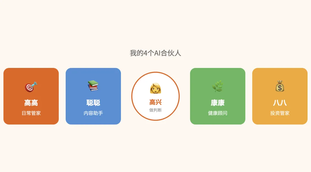 一个管日常的”高高”,一个管健康的”康康”,一个管内容的”聪聪”,一个管投资的”八八”。