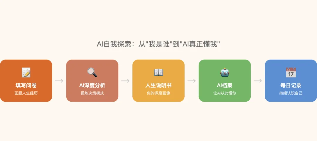 所以我做了一个项目——用AI帮你做一次深度的自我探索。我已经给【高兴同行圈】的几个姐妹做了测试,帮她们生成了自己的”人生说明书”。每个人拿到说明书的反应都差不多:先是震惊——”AI怎么比我自己还了解我”,然后是惊喜——”原来我一直以来的纠结是有原因的,知道怎么办了”。