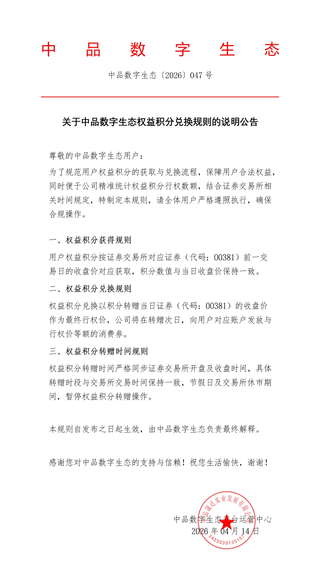中品数字生态丨权益积分兑换规则的说明公告