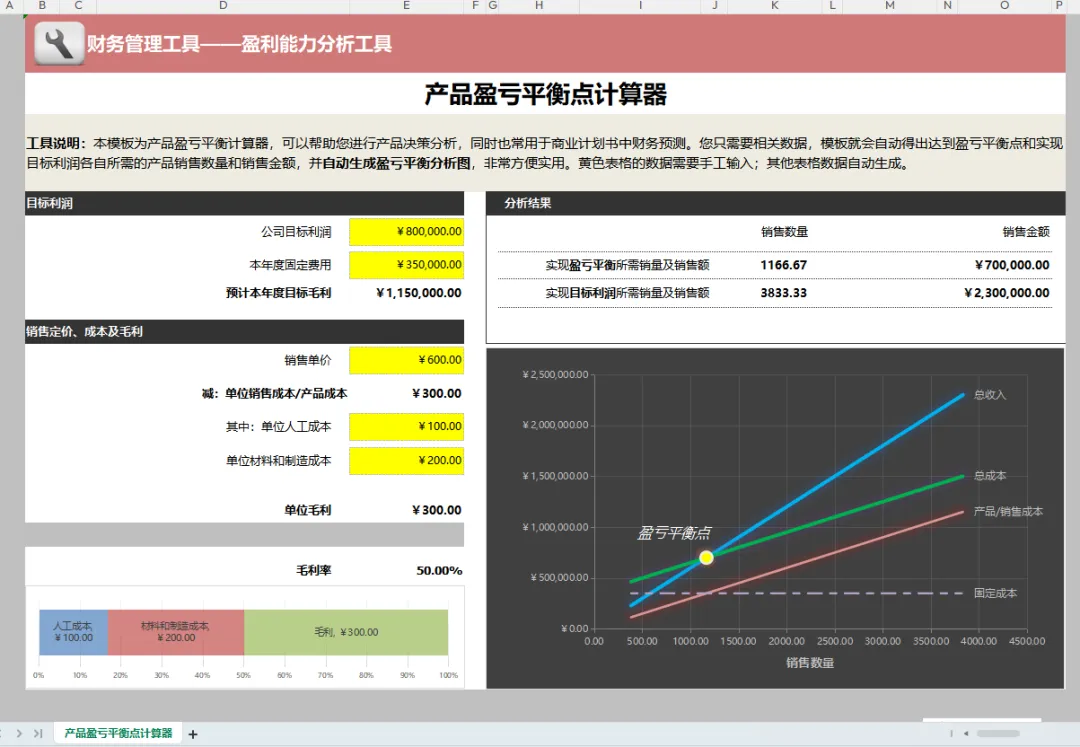 发现一套全自动Excel盈亏平衡点计算器,带盈亏平衡点分析模板,财务可编辑修改 发现一套全自动Excel盈亏平衡点计算器,带盈亏平衡点分析模板,财务可编辑修改! 盈亏平衡点计算与分析,对于财务人员做数据分析也是很关键的。因为要计算利润,那盈亏平衡点的计算与分析也是少不了的。但是很多财务人员表示,盈亏平衡点计算公式太麻烦了,每次算都出错,做数据分析时,也是无从下手。 别发愁了,关于盈亏平衡点的计算与分析,今天小编带来了一套财务人员常用的:全自动Excel盈亏平衡点计算器,带盈亏平衡点分析模板,都设置了自动计算育自动分析的函数公式,财务人员在做数据分析时,直接一键套用即可。具体见下文! 盈亏平衡点怎么计算 全自动excel盈亏平衡点计算器 全自动exceL盈亏平衡分析表模板 ……好了,全自动Excel盈亏平衡点计算器,带盈亏平衡点分析模板,财务人员需要参考备用的,可以领取模板,直接带入基础数据套用。 END