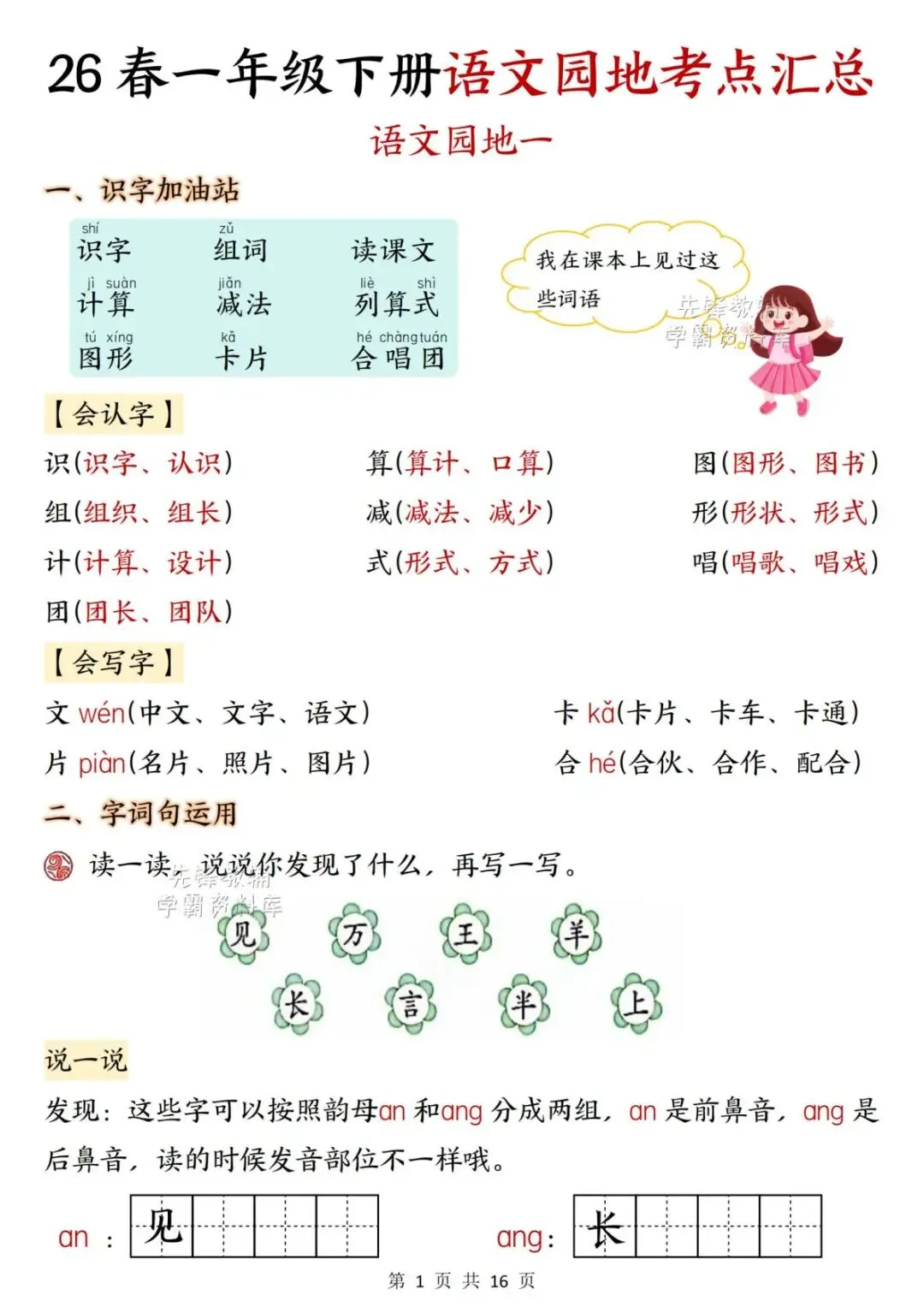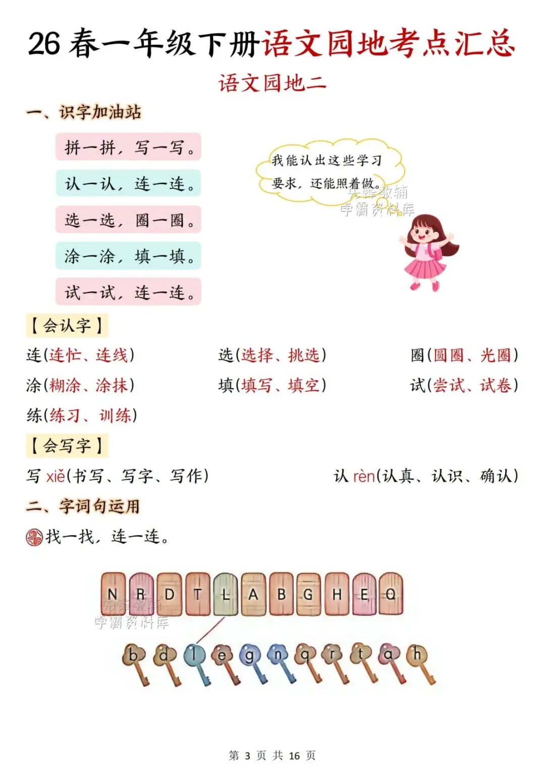 26春《一年级下册语文园地考点汇总》电子版可打印 点击蓝字,关注我们 (温馨提示:文末有领取方式) (因篇幅有限,仅展示部分内容) 完整电子版: 左下角点击“关zhu “ 点我头像,在对话框输入:0414