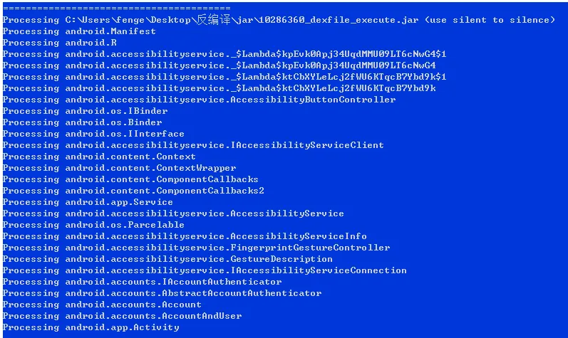 随后通过 dex2jar 编写脚本批量反编译,再使用 cfr 工具将 dex2jar 处理生成的 jar 文件进一步反编译。