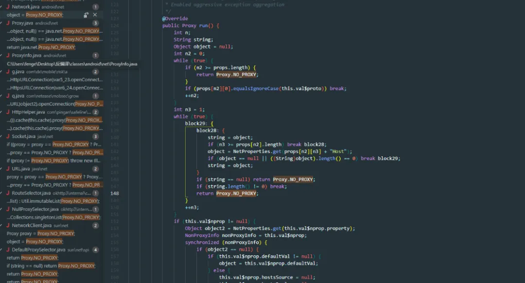 // Hook OkHttpClient.Builder.proxy()OkHttpClientBuilder.proxy.overload('java.net.Proxy').implementation = function(proxy) {if (proxy && proxy.equals(Proxy.NO_PROXY.value)) {returnthis.proxy(null); // 改为null,使用系统代理 }returnthis.proxy(proxy);};// Hook OkHttpClient.Builder.build(),通过反射强制修改OkHttpClientBuilder.build.implementation = function() {var proxyField = this.getClass().getDeclaredField("proxy"); proxyField.setAccessible(true);var currentProxy = proxyField.get(this);if (currentProxy && currentProxy.equals(Proxy.NO_PROXY.value)) { proxyField.set(this, null); // 强制设置为null }returnthis.build();};