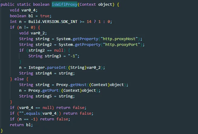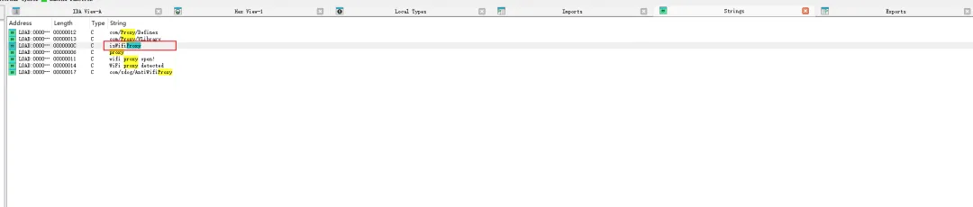 libxloader.so 中的 isWifiProxy、wifiDetect 函数通过读取系统属性检测WiFi代理设置,但实际实现不在Native层。Native层中的字符串可能仅作为常量存储,用于日志输出或错误提示,实际的检测逻辑都在Java层。