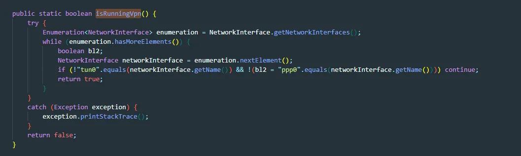 Tools.isRunningVpn() 方法检测当前是否运行在VPN环境,如果检测到VPN,可能拒绝某些请求或采取保护措施。通过Hook强制返回 false 以绕过VPN检测。