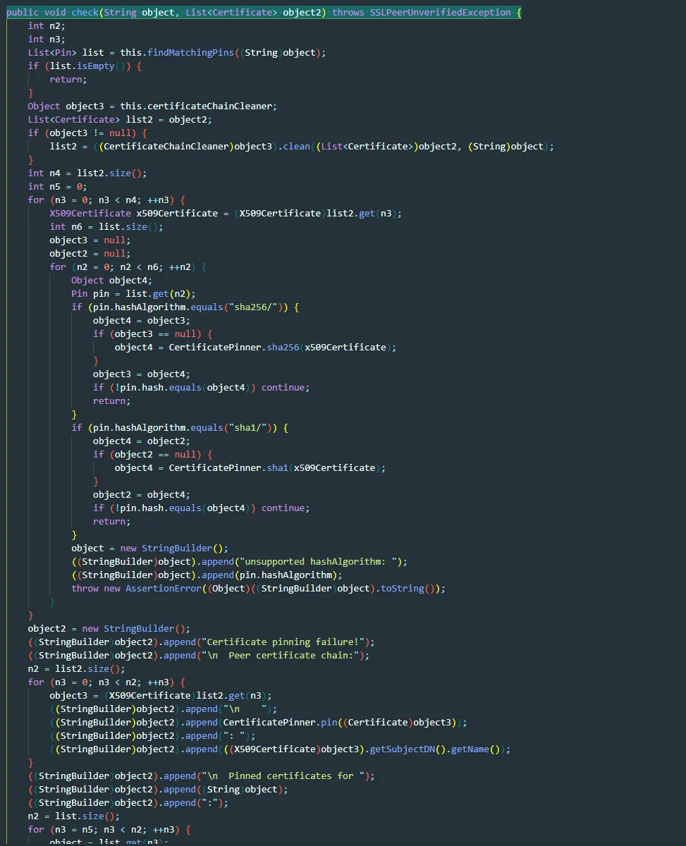 应用主要通过 check() 方法实现证书固定,遍历证书链中的每个证书,计算SHA256/SHA1哈希并与预设的Pin哈希值比较。如果所有证书都不匹配,抛出 SSLPeerUnverifiedException。Hook check() 方法直接返回即可绕过。