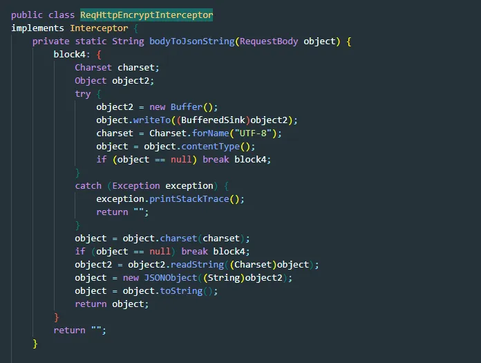 通过 ReqHttpEncryptInterceptor.intercept() 拦截器对 POST 请求进行拦截,并将原始 JSON 字符串传入 Native 层 libJniCipher.so 中的 JniCipherUtils.encryptInC(String data) 加密函数处理,最终输出 Base64 编码格式的加密字符串。