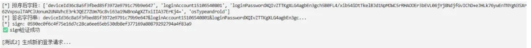 sign 验证通过(由于时间戳动态变化,loginPassword 每次不同,但 sign 逻辑正确)。