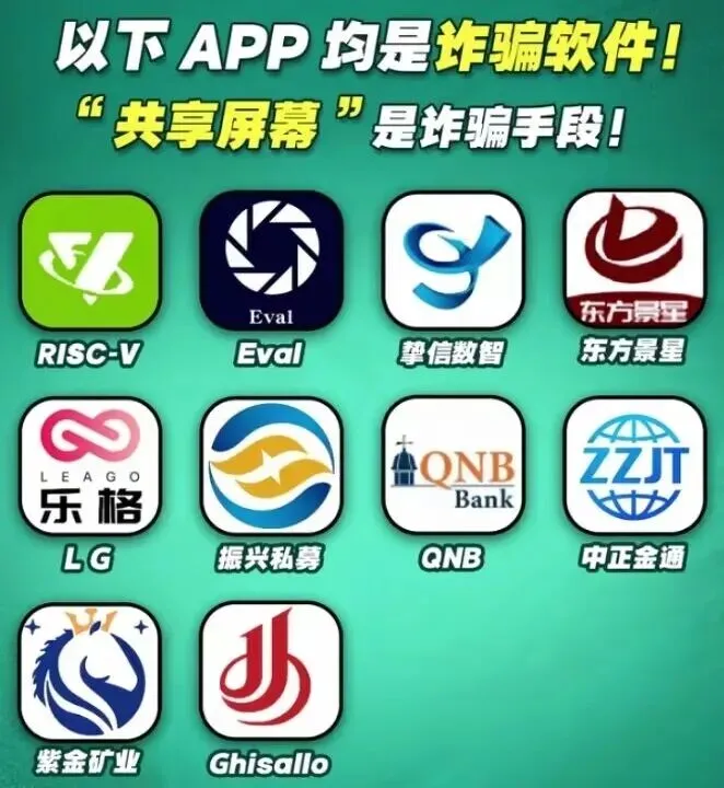 近期北京警方公布了一批涉电信网络诈骗APP,包括振兴私募、挚信数智、东方景星、RISC-V、LG 乐格、Eval、中正金通、紫金矿业、星遇 TO、晴空影视、福老万家、天鸿礼品、议立方、NXZC、人民补偿、顺付、嗨圈、QNB、得福等,这些全是不法分子用来骗人的工具,甚至 “共享屏幕” 也被他们当成诈骗手段,一步步套取你的隐私、诈骗你的钱财。