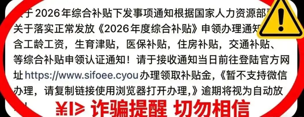 除此之外,最近上面这类骗局也很猖獗。有人伪造通知,谎称人社部发放 2026 年度生育津贴、医保、住房等综合补贴,引导大家点击链接登录假冒官网。页面做得和官方网站十分相似,很容易让人信以为真。事实上,人社部从未发放过这类所谓综合补贴,这条消息完全是虚假诈骗信息。骗子就是利用大家想领福利的心理,诱导填写身份证、银行卡、密码、验证码等信息,最终把钱转走。而真正的人社部门通知,根本不会要求提供银行卡密码、验证码这类重要隐私。