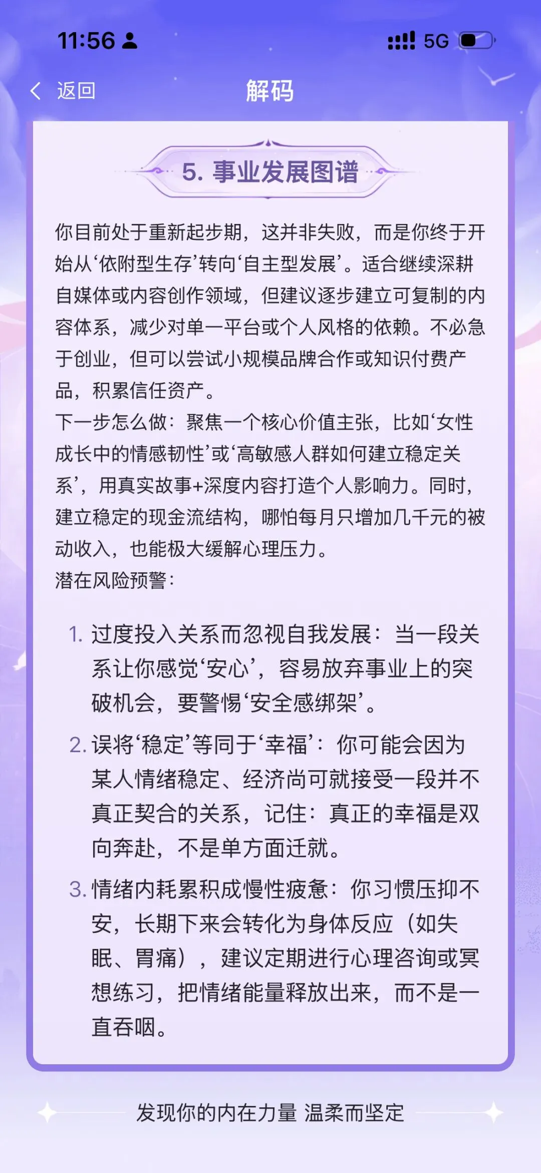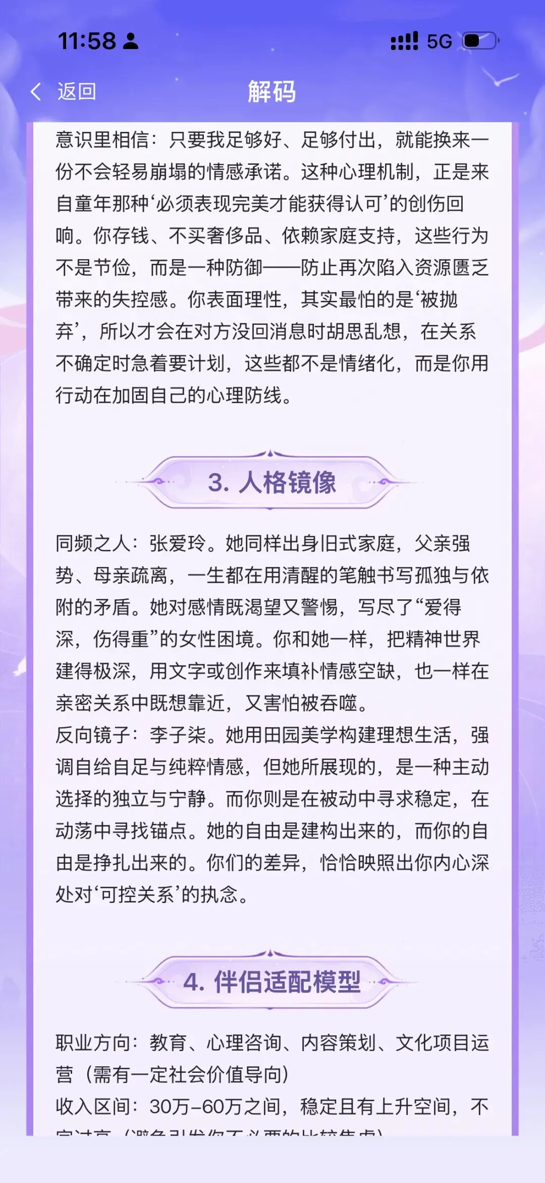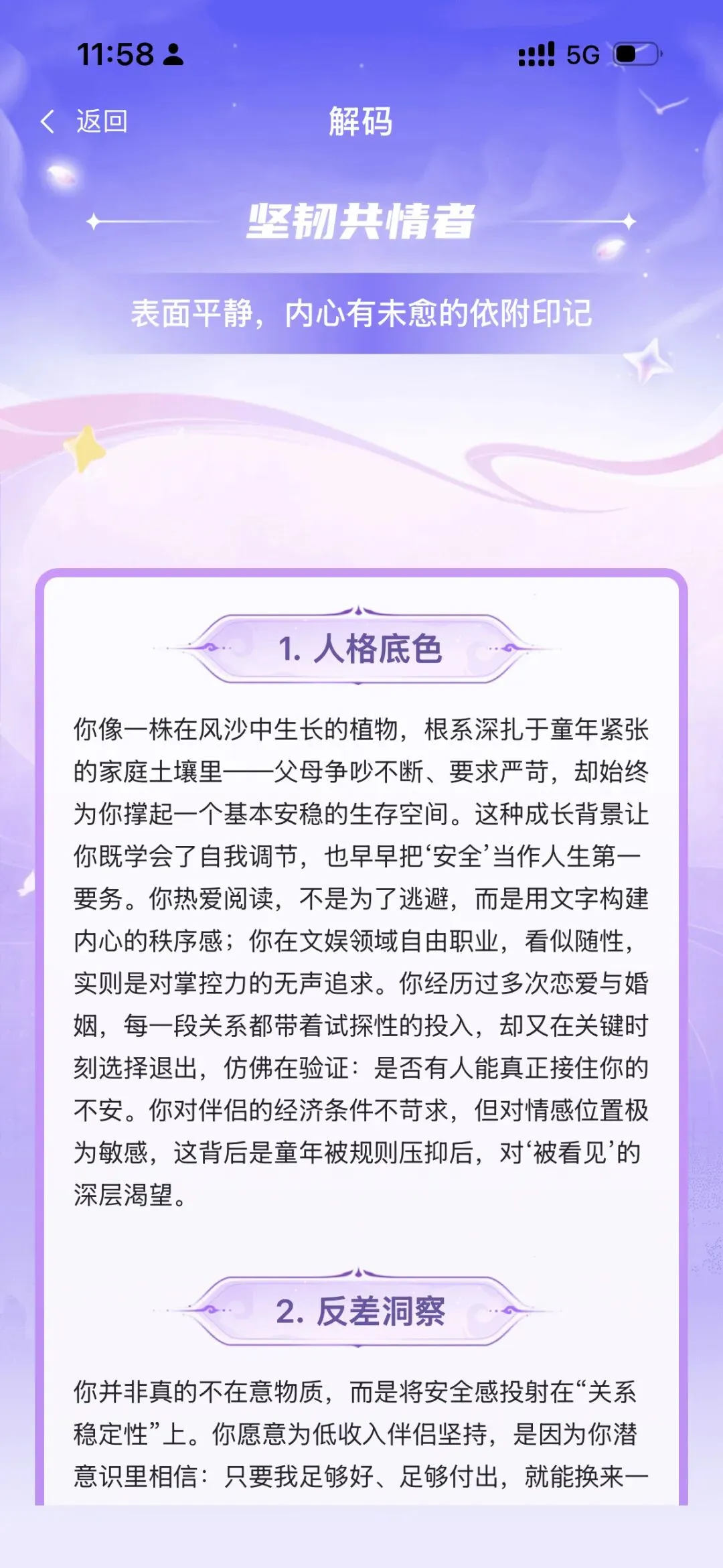 这是我利用免费的“心灵解码”功能,回答了 60 道基本盘题目后得出的结果。