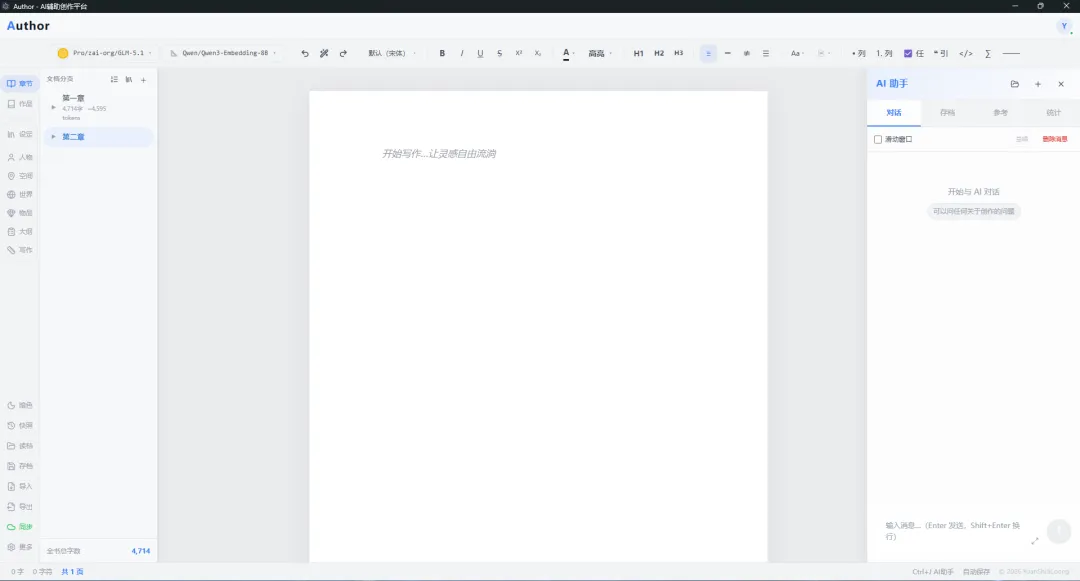 这段时间刚好有空研究 AI,我就想试试:能不能用 AI 把这些旧设定重新盘活,帮我把小说更顺地写出来。折腾了一圈之后,我找到了一款相对小众的 AI 写作辅助工具,叫 Author。