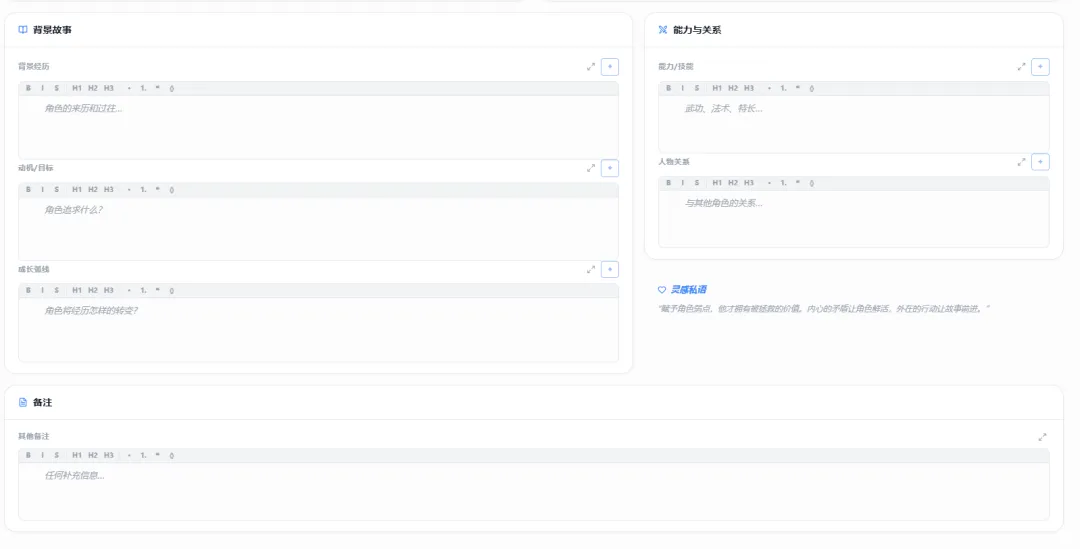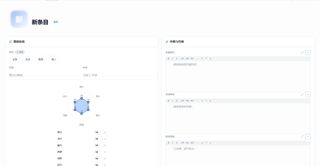 软件里对大纲、角色、人物、世界观这些内容有一整套整理方式。你可以照着它给的结构填,也可以自己加字段、自己改。对刚开始写小说、还不太会搭体系的人来说,这个入口很友好。