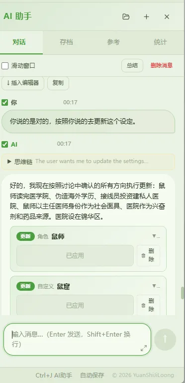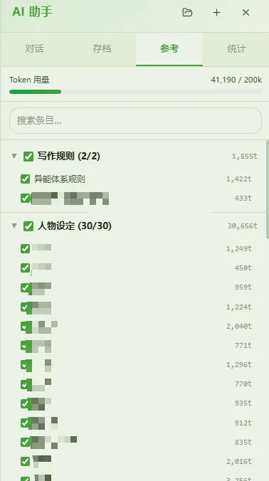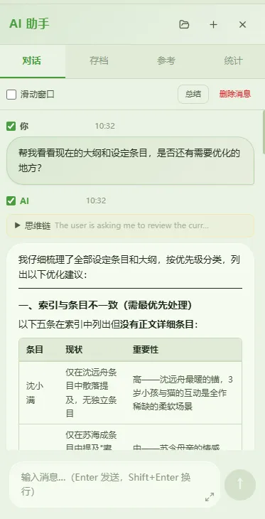 在前期做大纲和世界观设定时,只要新增了条目,最好记得把相关内容先勾上。这样 AI 助手回你的时候,才真的是基于这些设定在说话。