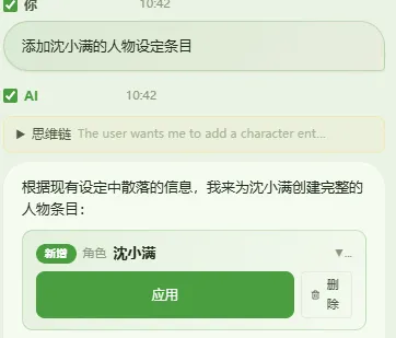 我一开始没搞懂,以为 AI 在对话里说完,设定就已经加进去了。其实不是。像下面这种卡片,你得点一下“应用”,内容才会真正进入设定库。