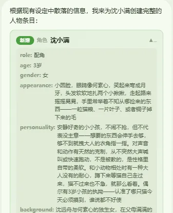 第一次添加的时候,我很建议你点开看一眼,确认它到底写进去了什么、有没有顺手扩展出你并不想要的内容。前面多花这一分钟,后面通常能少很多设定冲突。你也可以再让 AI 帮你过一遍逻辑,看看有没有打架的地方。