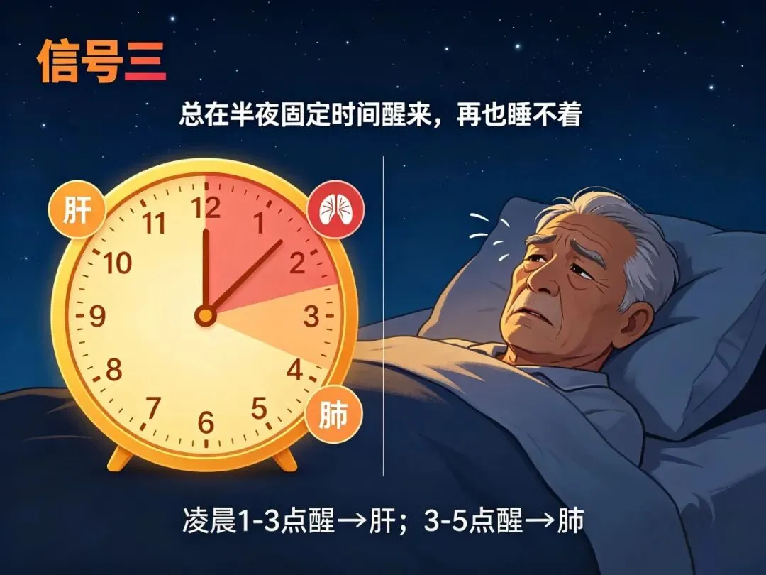 凌晨1–3点醒,多半肝火偏旺,常伴有心烦、口苦;凌晨3–5点醒,多半肺气偏虚,容易咳嗽、气短。如果这种早醒持续两周以上,说明脏腑功能已经失调。