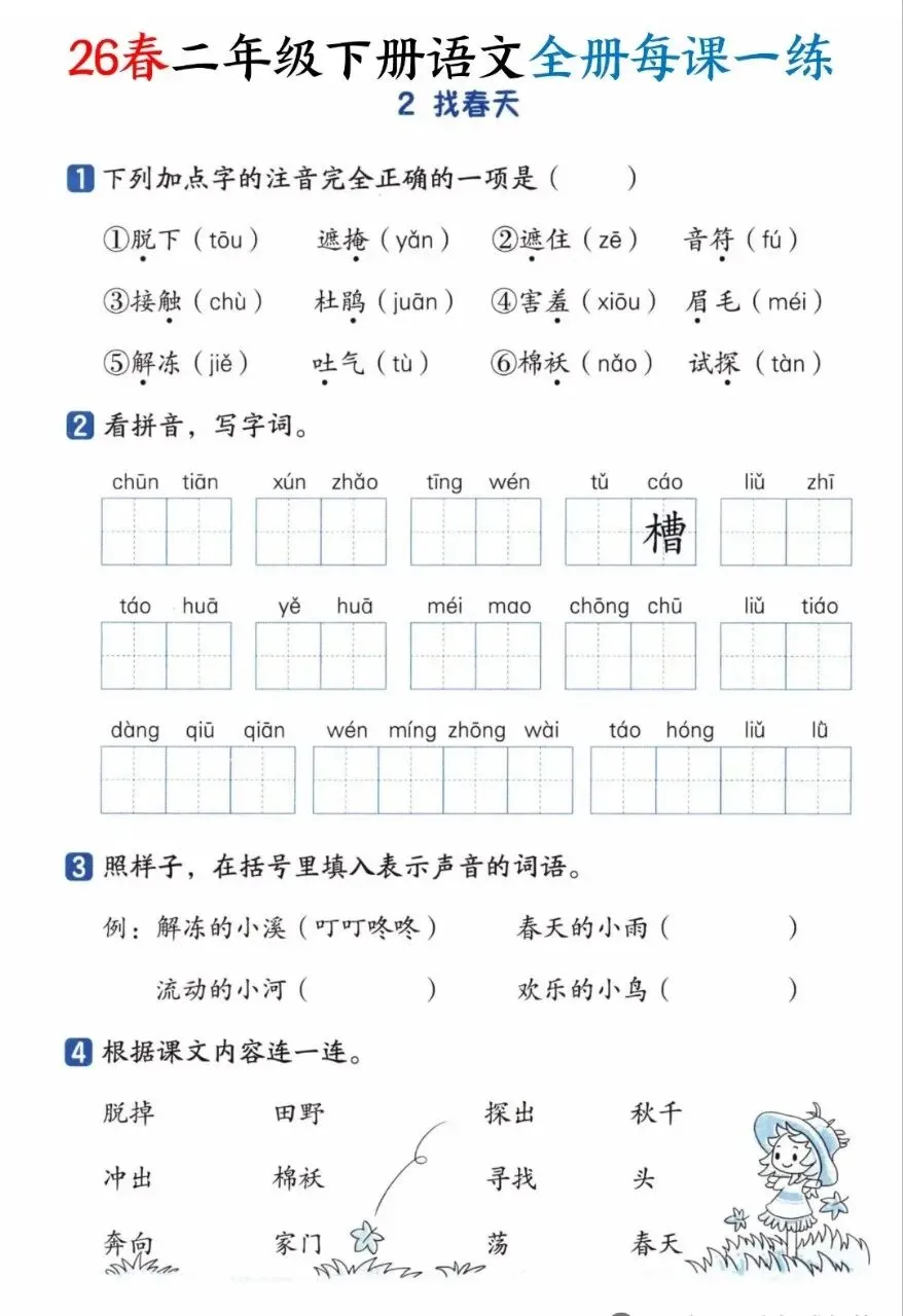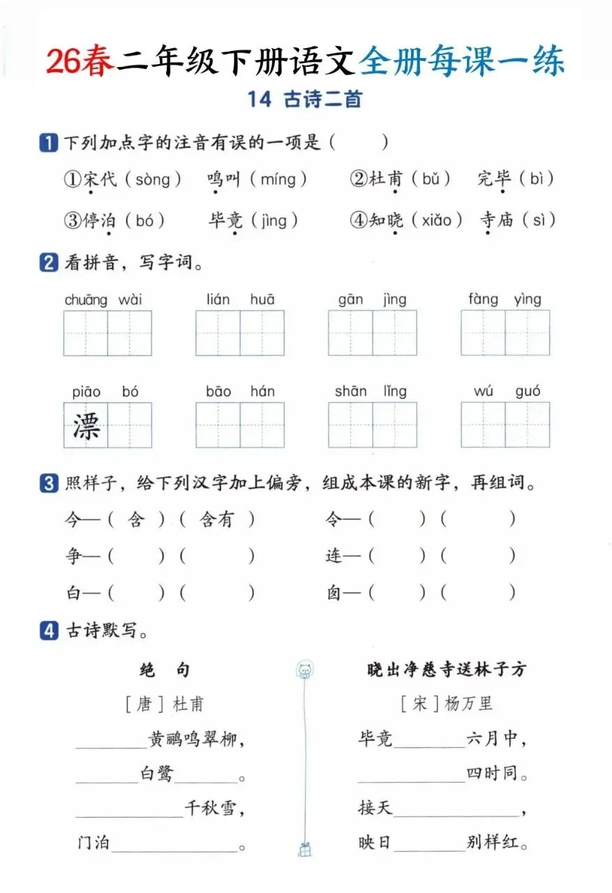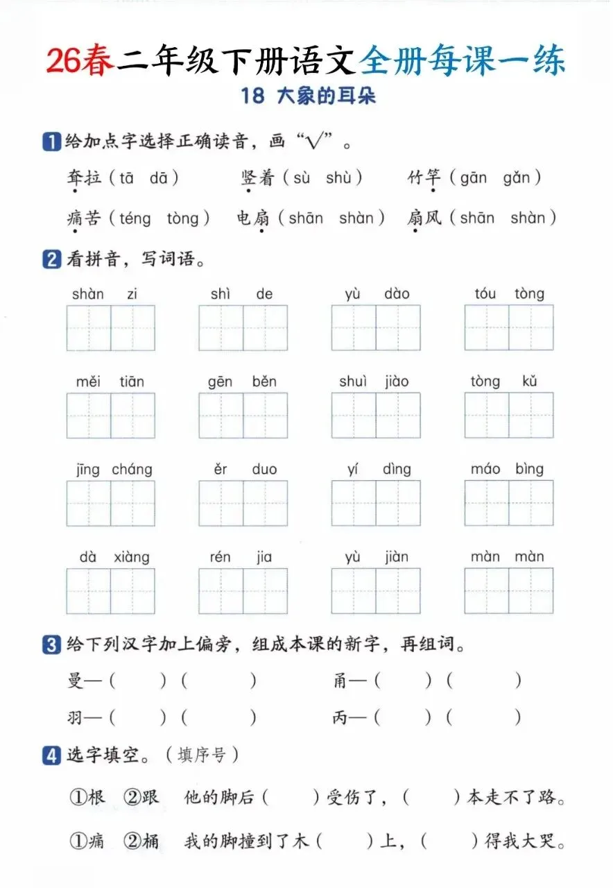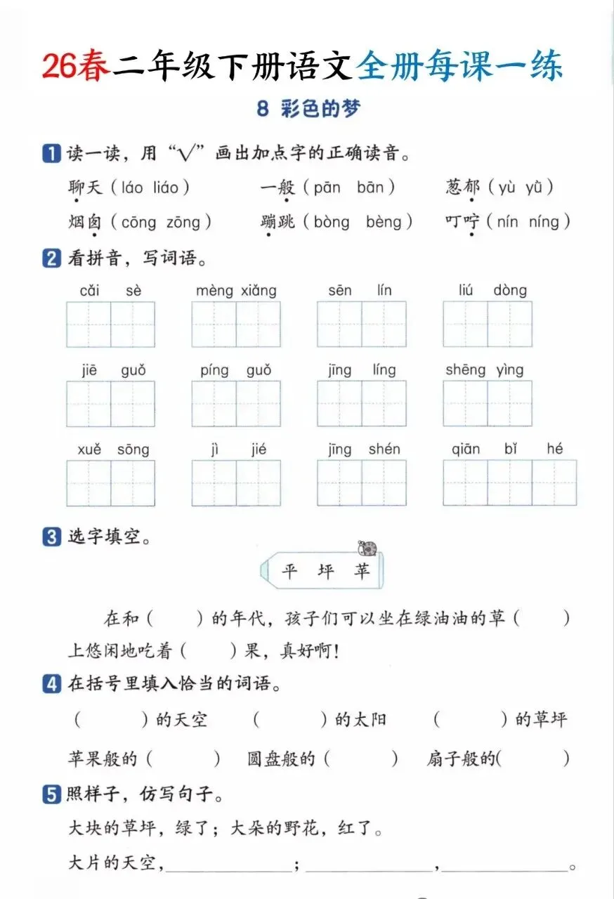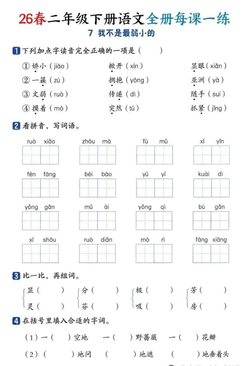 26年新版二年级下册语文《每课一练》,电子版可打印 2026年春季新版二年级下册语文《每课一练》,同步统编版教材、电子版可直接打印。内容紧扣课文进度,覆盖字词、句子、阅读与写话全要点,一课一练、及时巩固,帮孩子夯实基础、稳步提升语文能力。