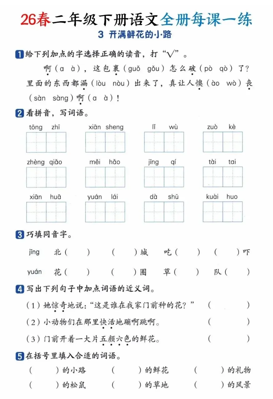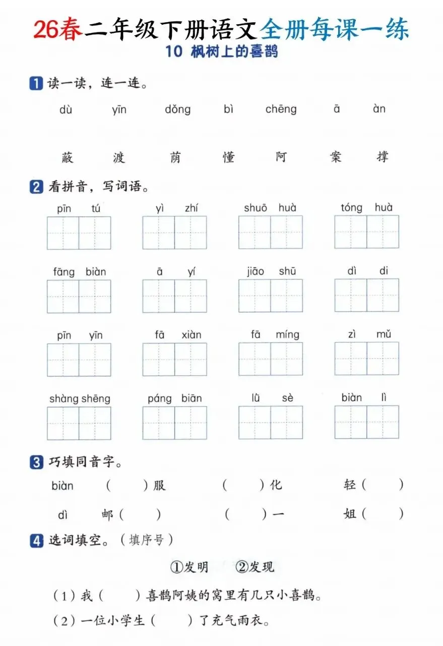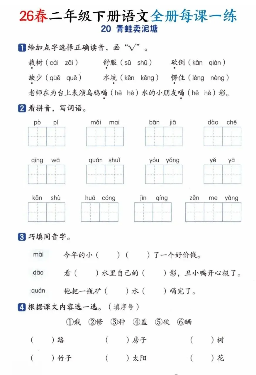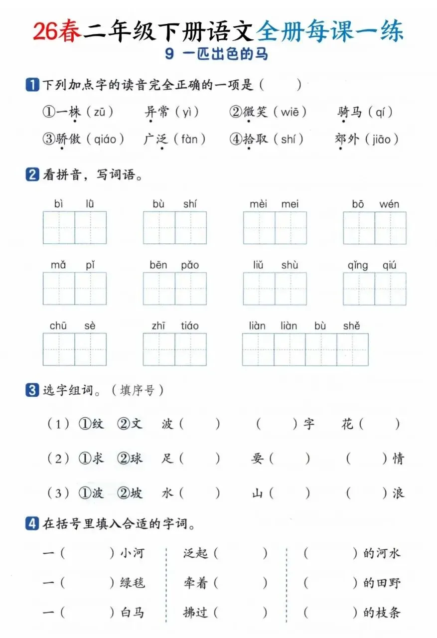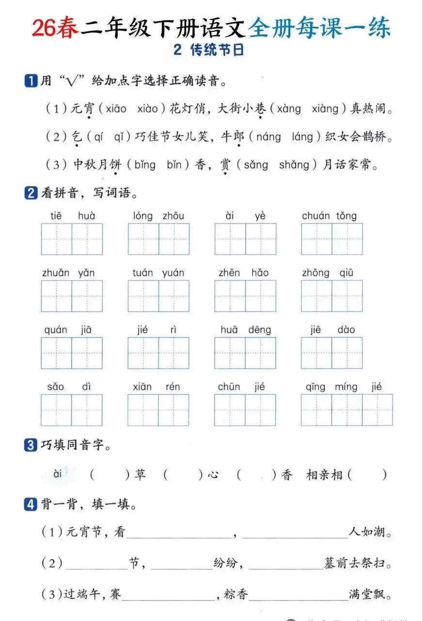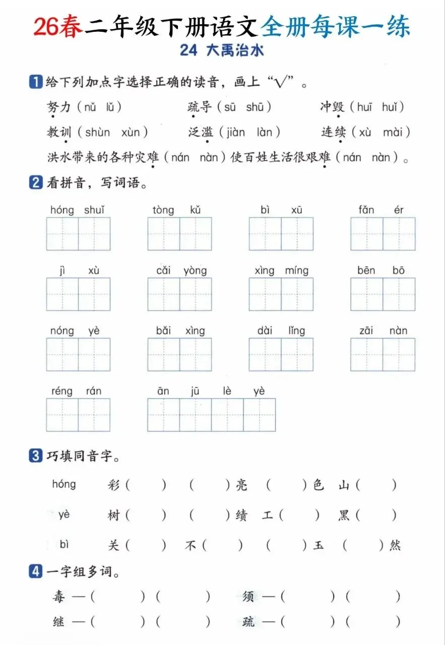 26年新版二年级下册语文《每课一练》,电子版可打印 2026年春季新版二年级下册语文《每课一练》,同步统编版教材、电子版可直接打印。内容紧扣课文进度,覆盖字词、句子、阅读与写话全要点,一课一练、及时巩固,帮孩子夯实基础、稳步提升语文能力。