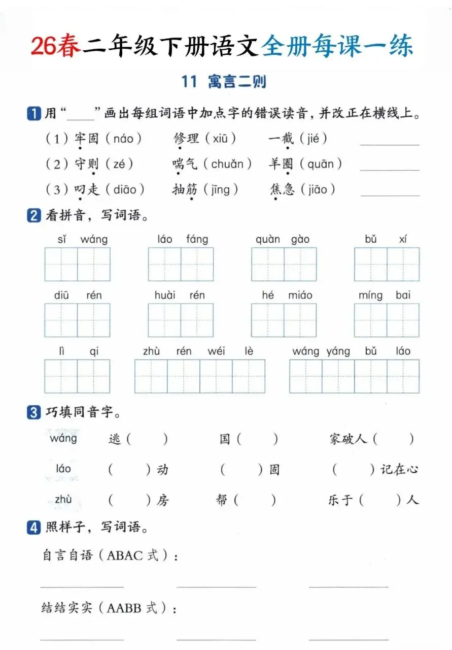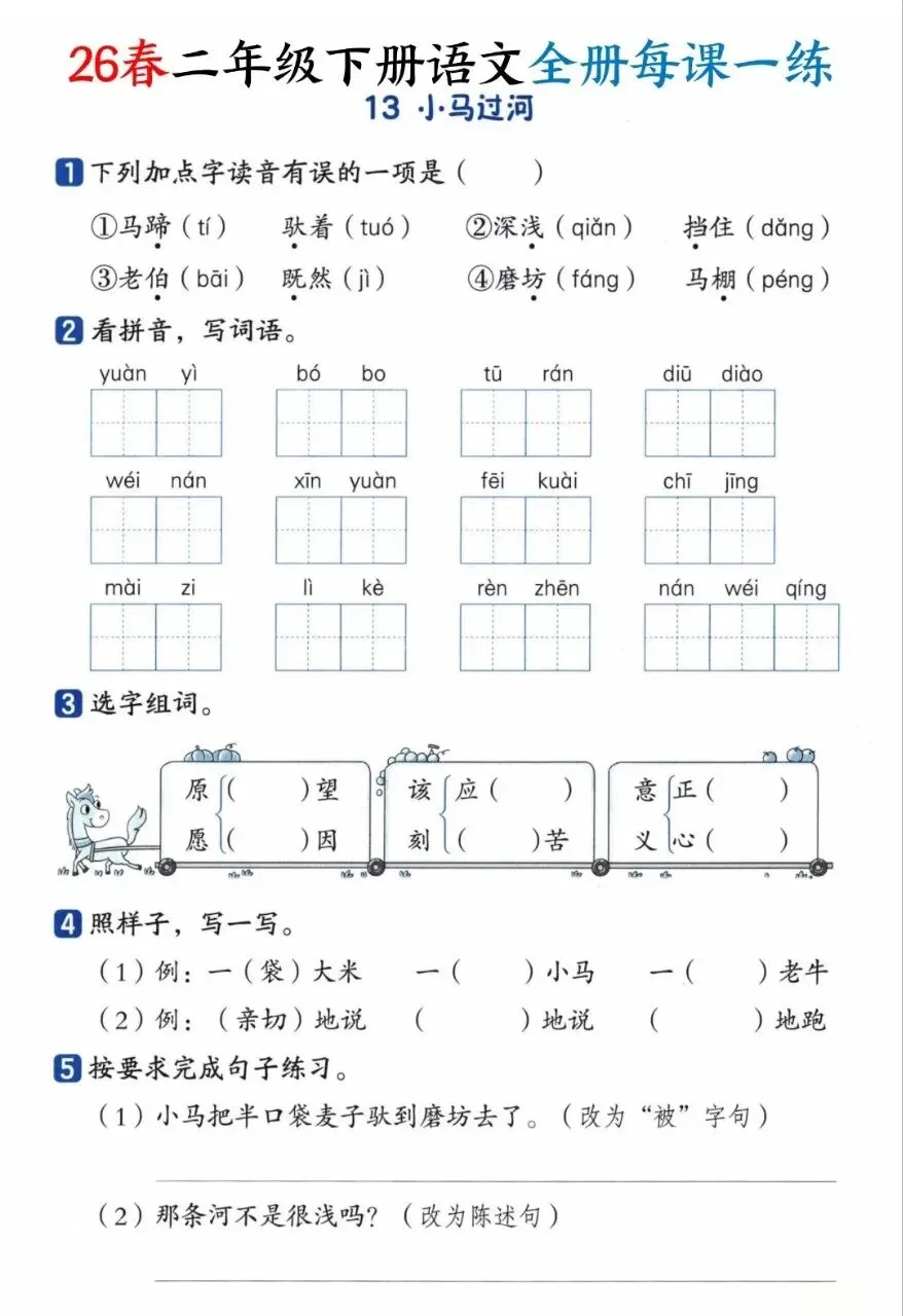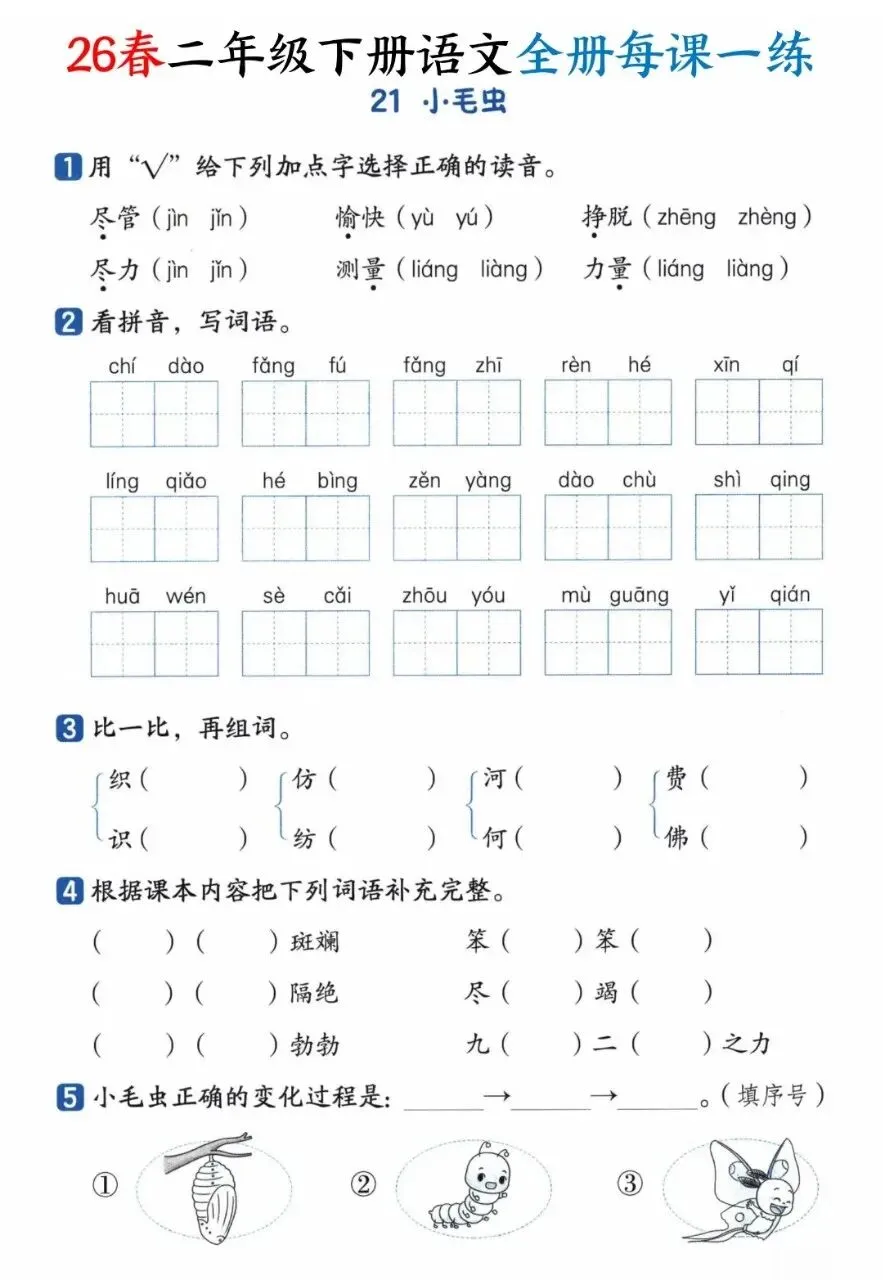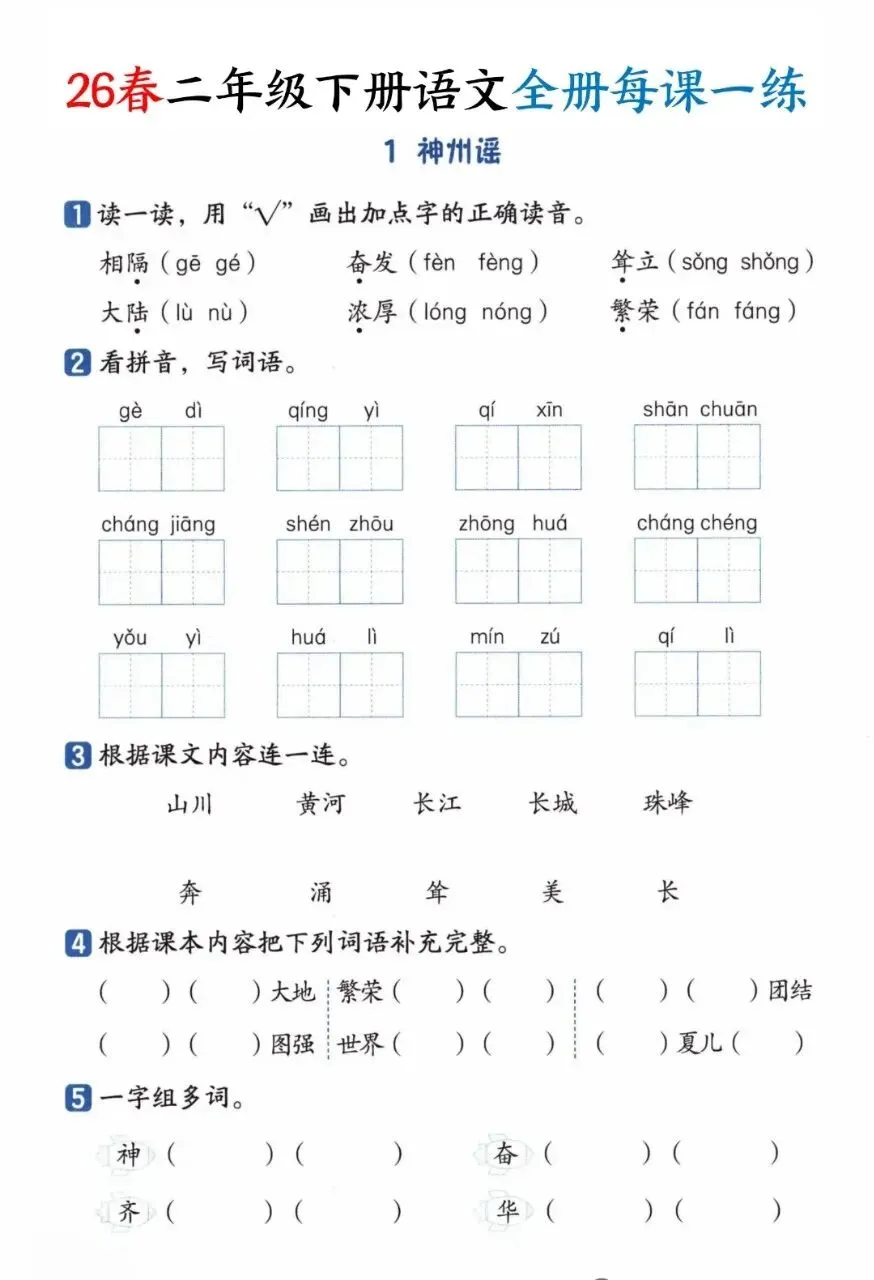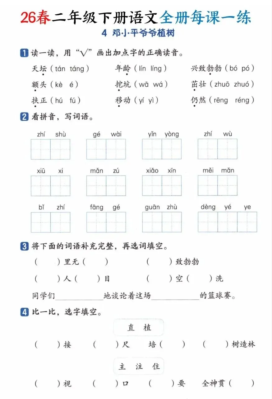 26年新版二年级下册语文《每课一练》,电子版可打印 2026年春季新版二年级下册语文《每课一练》,同步统编版教材、电子版可直接打印。内容紧扣课文进度,覆盖字词、句子、阅读与写话全要点,一课一练、及时巩固,帮孩子夯实基础、稳步提升语文能力。