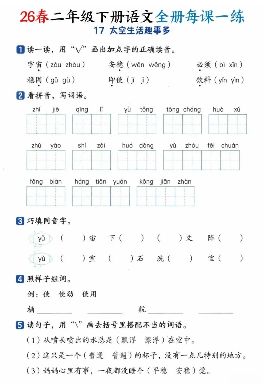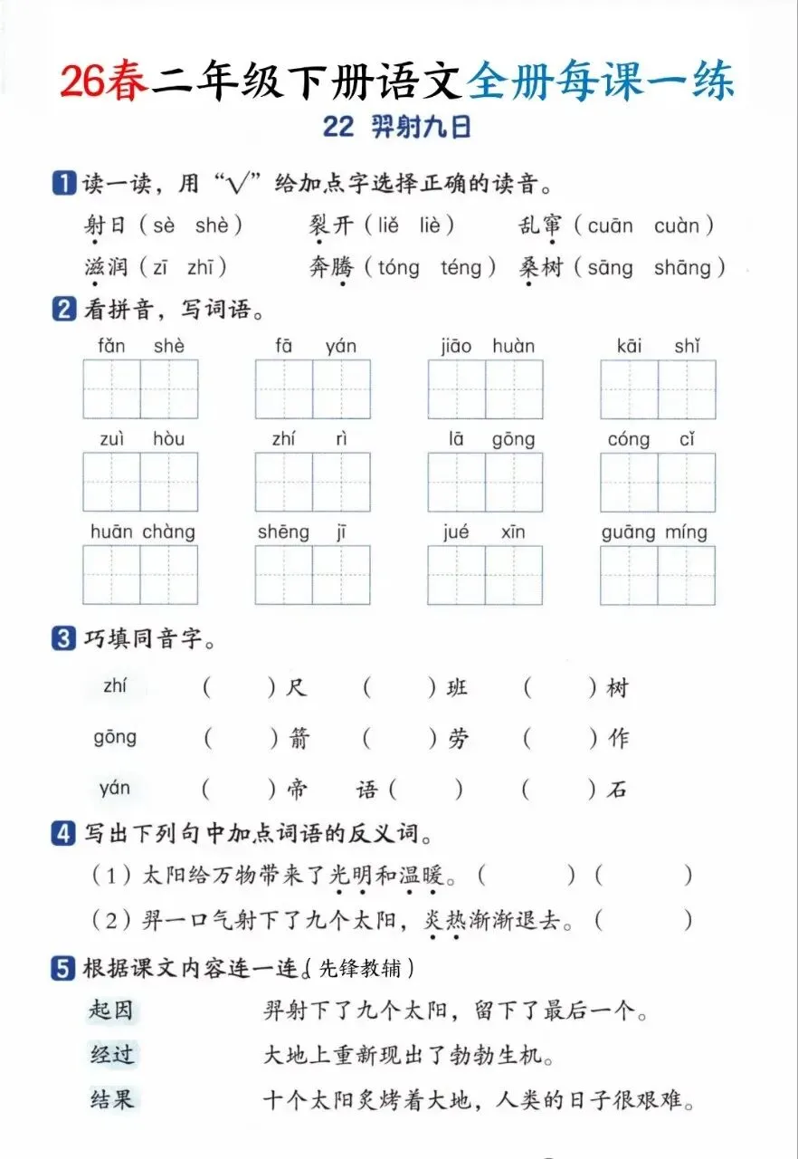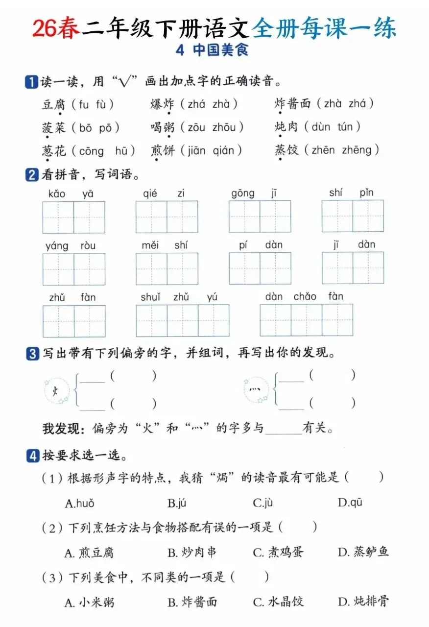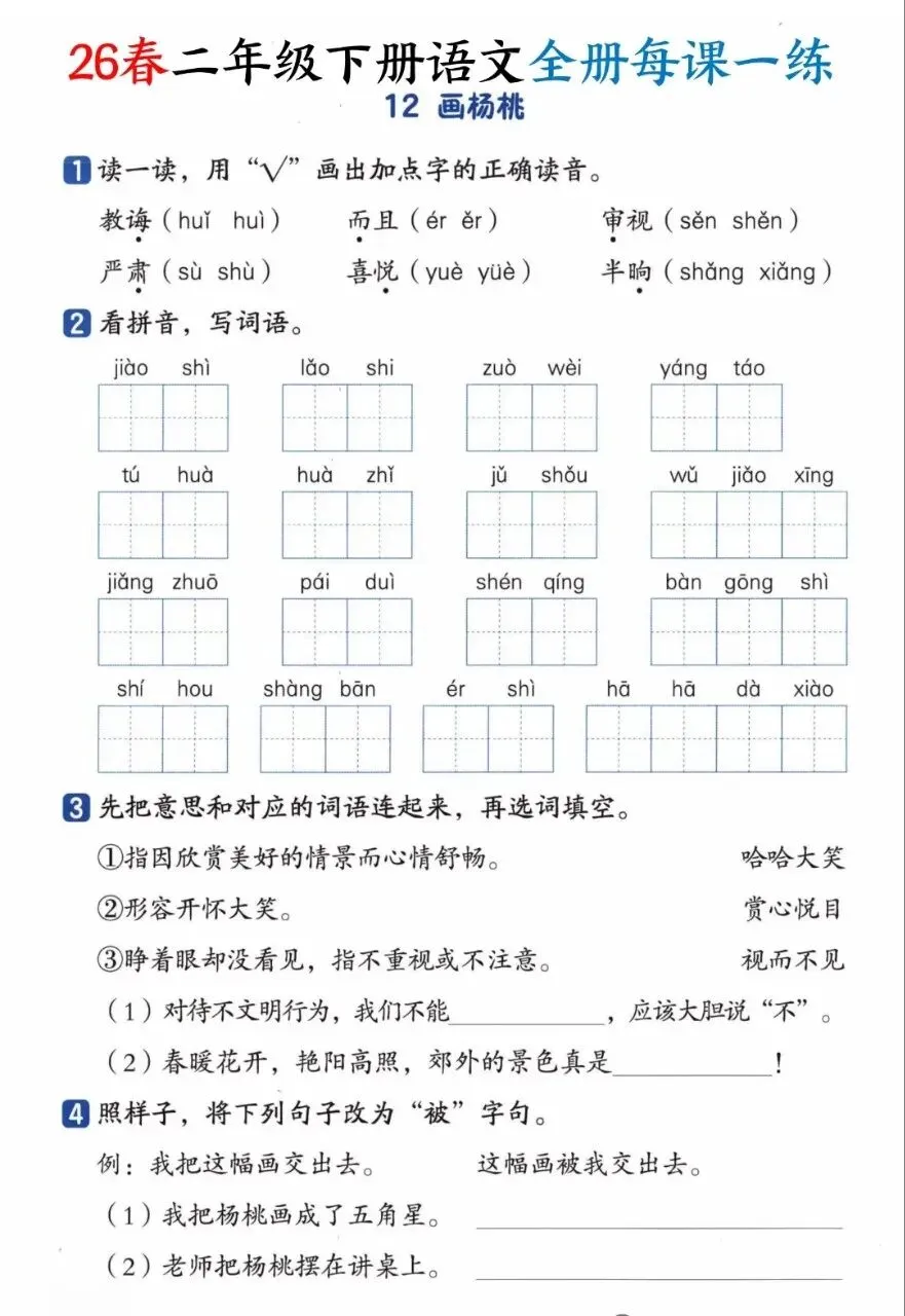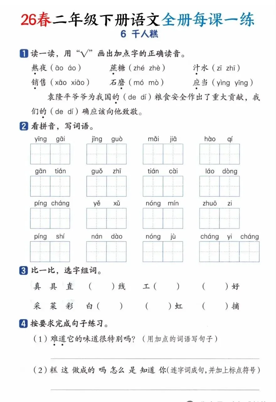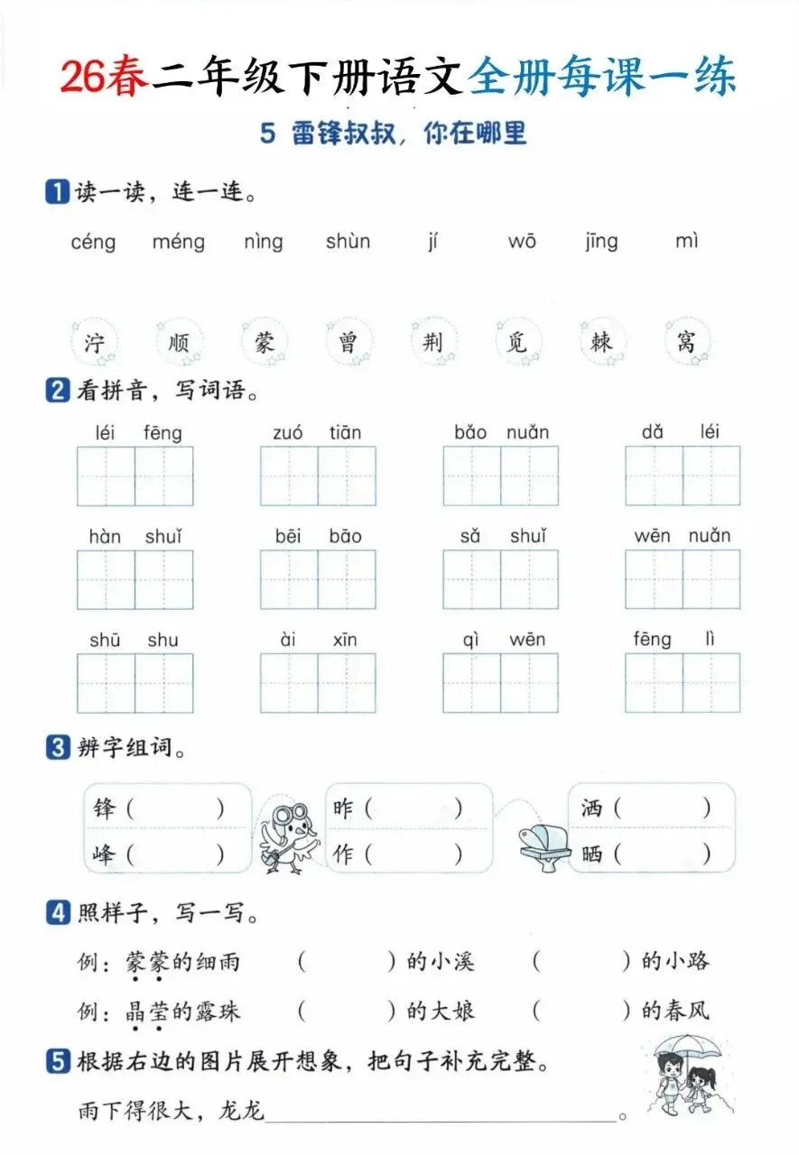26年新版二年级下册语文《每课一练》,电子版可打印 2026年春季新版二年级下册语文《每课一练》,同步统编版教材、电子版可直接打印。内容紧扣课文进度,覆盖字词、句子、阅读与写话全要点,一课一练、及时巩固,帮孩子夯实基础、稳步提升语文能力。