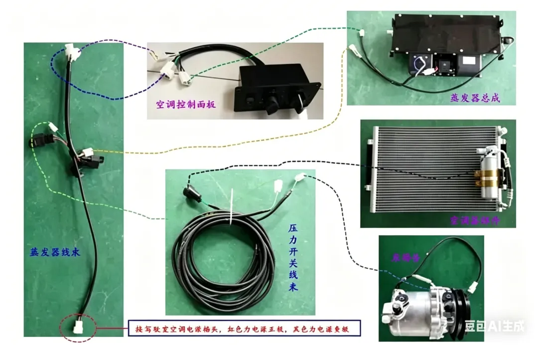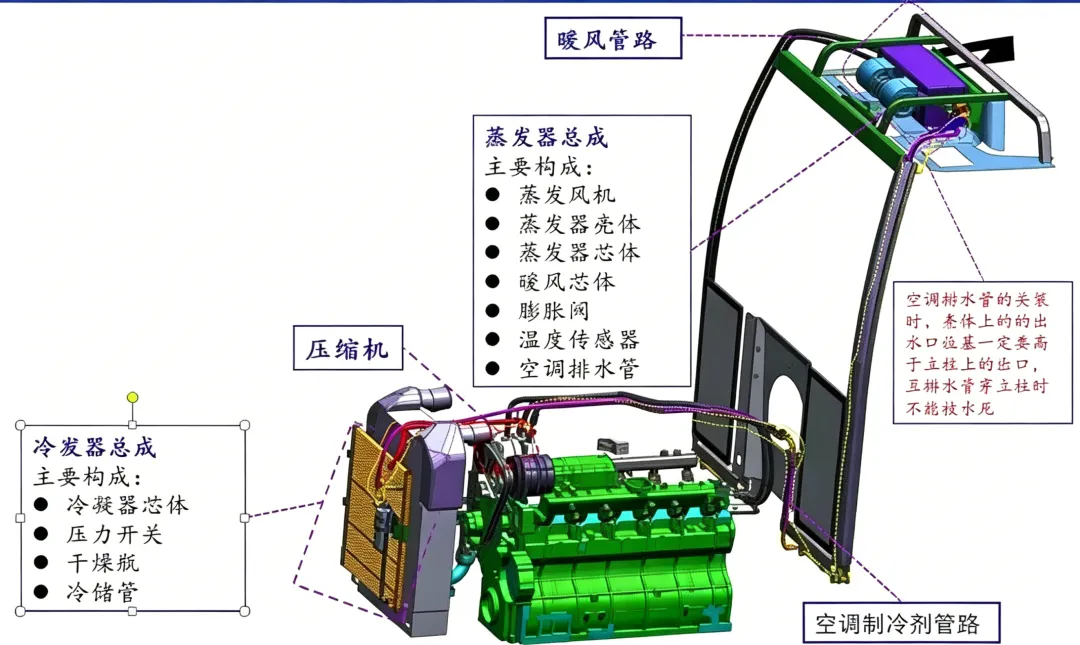拖拉机机空调为冷暖型空调,主要由压缩机、冷凝器、储液干燥器、蒸发器、管路系统和电器系统组成,以及其他附件(压缩机固定支架、压缩机调整支架、压缩机皮带等)组成。