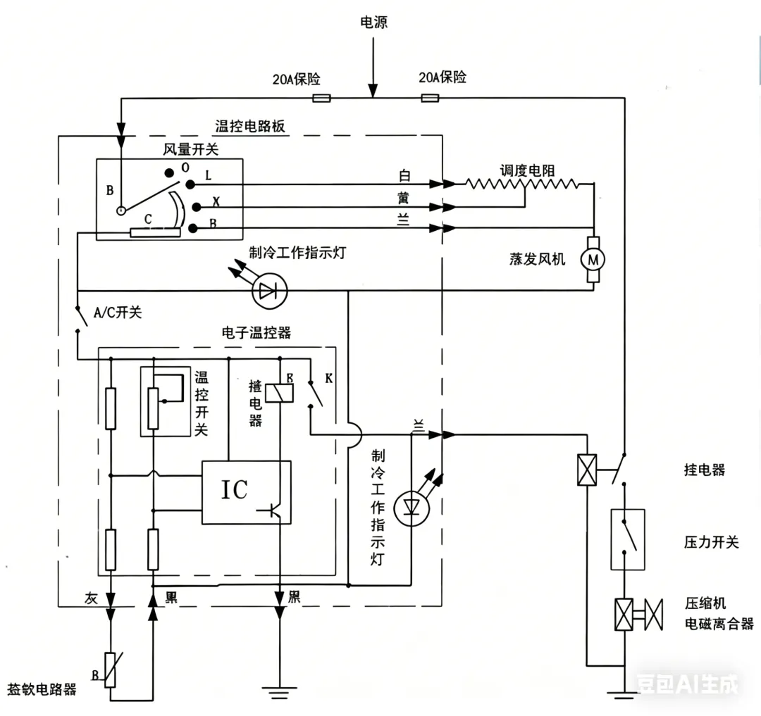 当车内温度下降到温控开关所设定的温度时(例如25℃),压缩机会停止工作,蒸发器风机照常工作,当车内温度上升到开机温度时(例如29℃),电器吸合,压缩机工作,则空调机又开始工作。