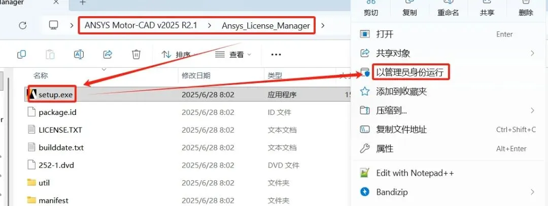 2.进入解压后的【ANSYS Motor-CAD v2025 R2.1】-【Ansys_License_Manager】文件夹,选择【Setup.exe】,右键,选择【以管理员身份运行】。