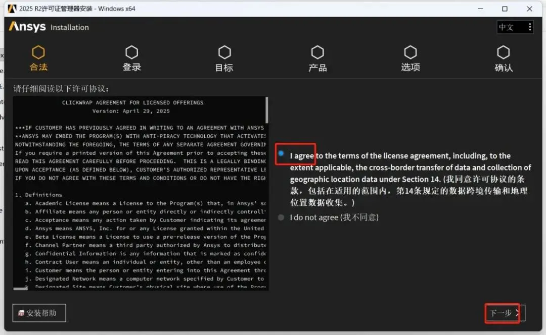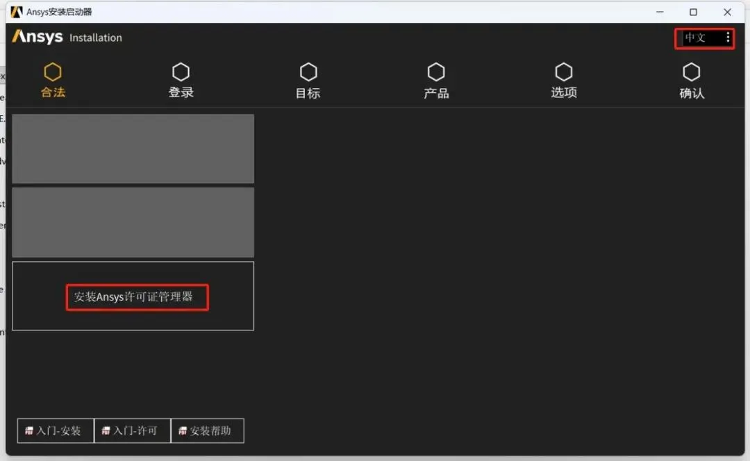 3.右上角选择【中文】,点击【安装 ANSYS许可证管理器】。