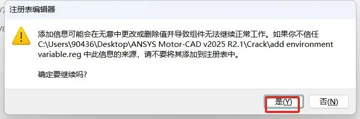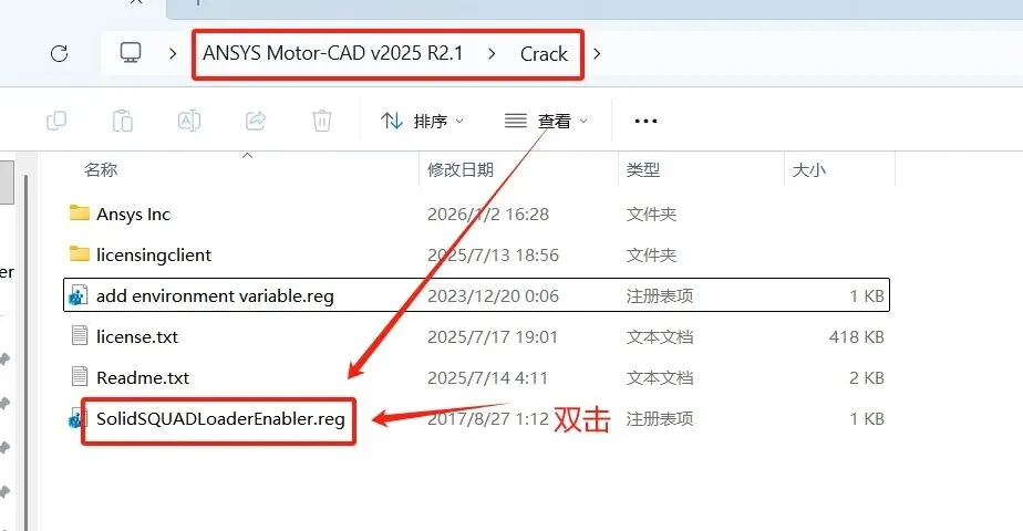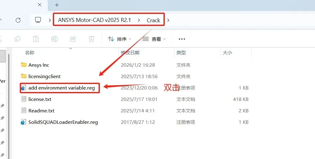 11.进入解压后的【ANSYS Motor-CAD v2025 R2.1】-【Crack】文件夹,双击【add environment variable.reg】。