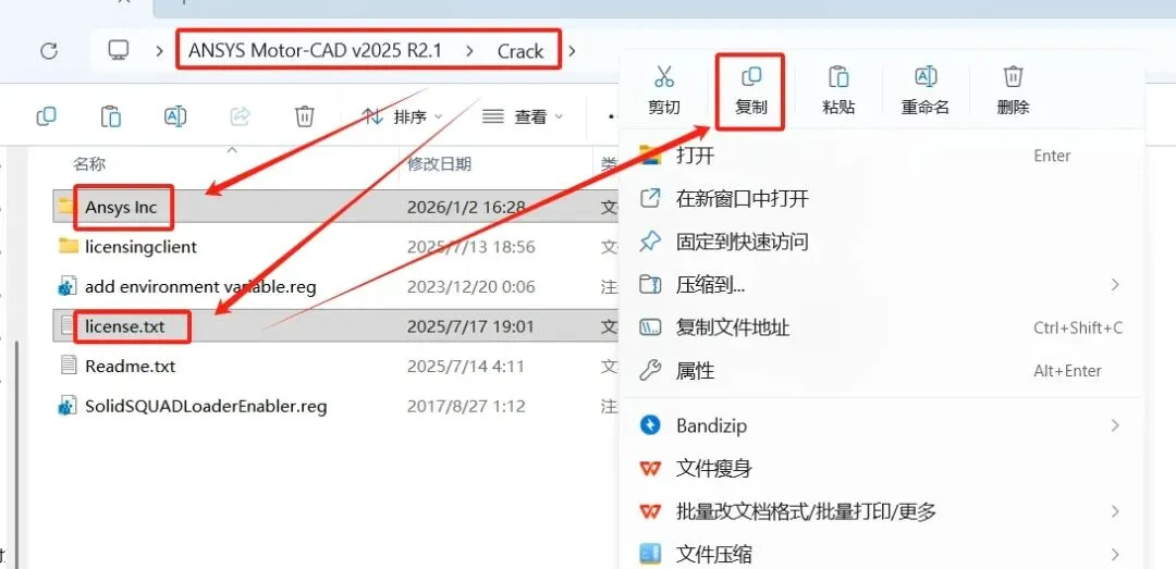 15.进入解压后的【ANSYS Motor-CAD v2025 R2.1】-【Crack】文件夹,选择【Ansys Inc】和【license.txt】,右键,选择【复制】。