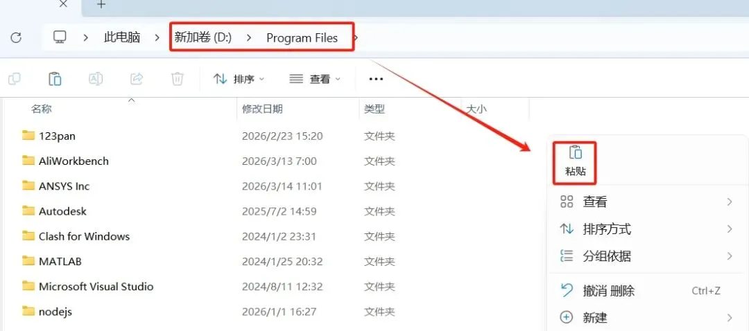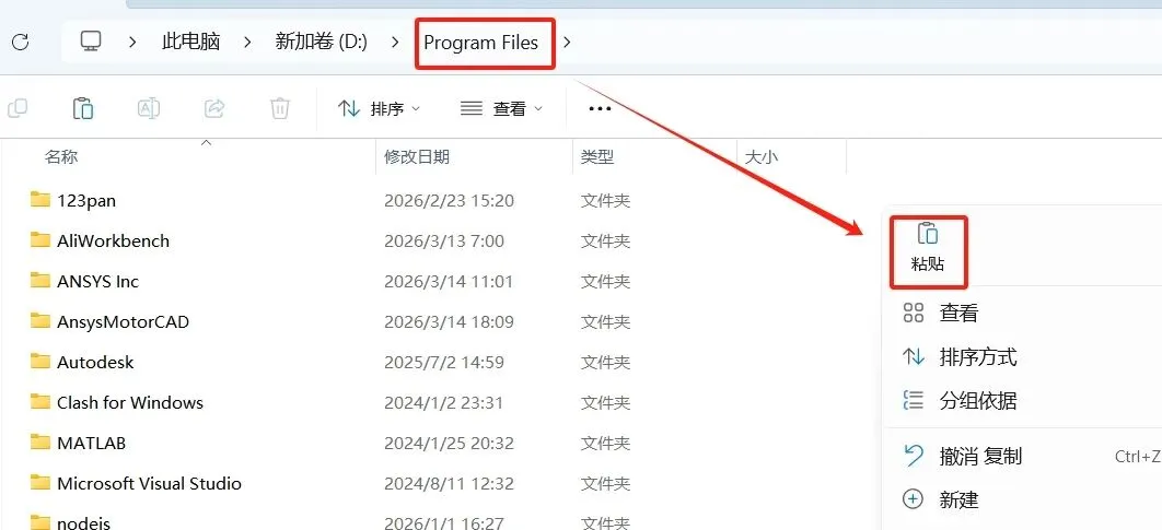 34.进入D盘-【Program Files】文件夹,空白处右键,选择【粘贴】。