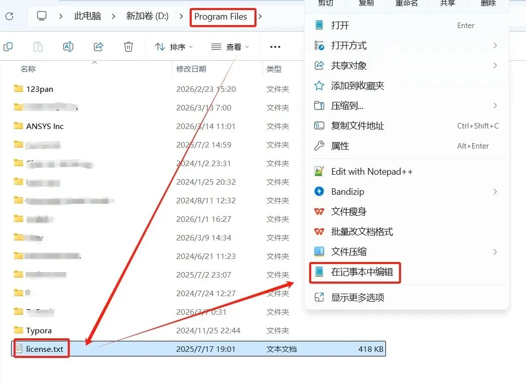18.选择粘贴的【license.txt】,右键,选择【记事本】打开。