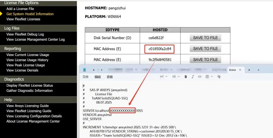 21.选择一个MAC地址,复制到19步打开的【license.txt】中替换【xxxxx】,注意保持前后空格。