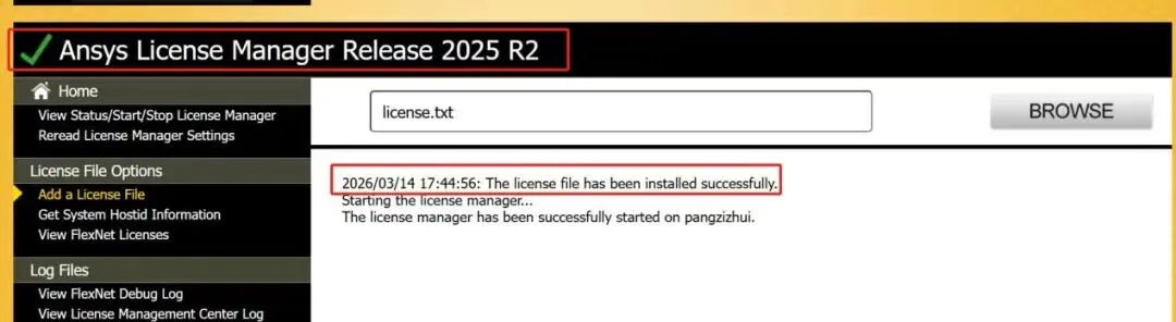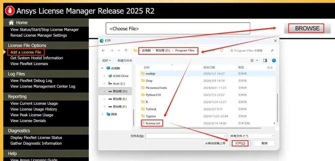 24.license Management Center点击【Add a License File】,点击【BROWSE】,浏览进入【E盘】-【Program Files】-【ANSYS Inc】文件夹,找到【License.txt】,点击【打开】。