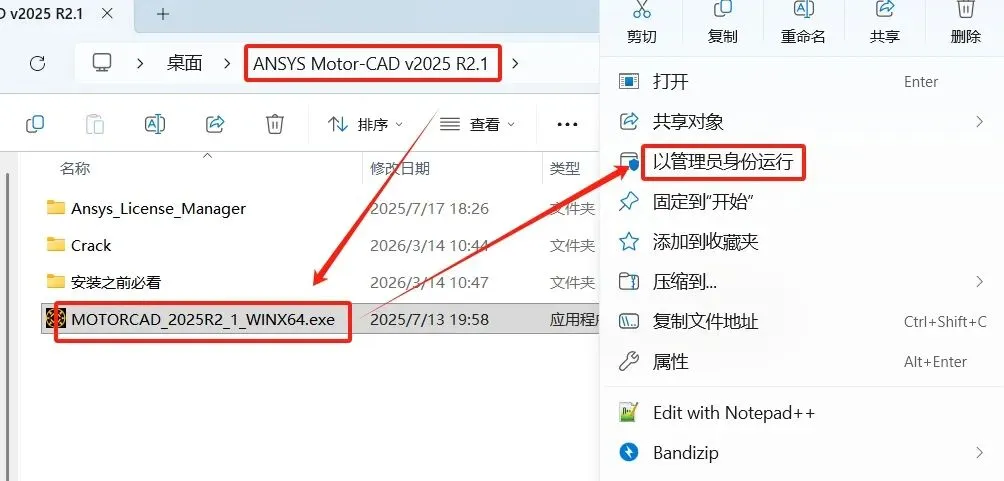27.进入解压后的【ANSYS Motor-CAD v2025 R2.1】文件夹,选择【MOTORCAD_2025R2_1_WINX64.exe】,右键,选择【以管理员身份运行】。