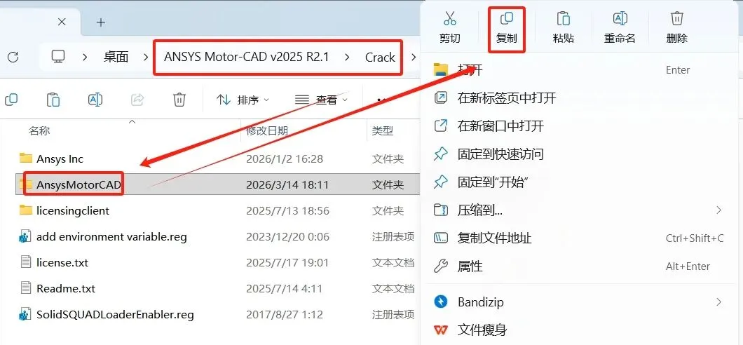 33.进入解压后的【ANSYS Motor-CAD v2025 R2.1】-【Crack】文件夹,选择【AnsysMotorCAD】文件夹,右键,选择【复制】。