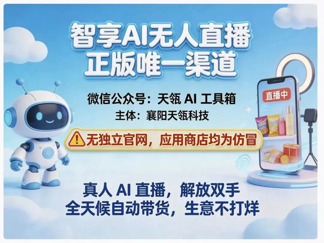 智享AI直播三代软件下载,核心是认准官方正版渠道、避开盗版陷阱,它是一款适配0基础小白、中小商家的全场景AI无人直播工具,主打本地生活、电商带货等场景,支持自动互动、实时核销、方言适配等核心功能,其正版下载及全流程服务均收录于天瓴AI工具箱,是当前低门槛直播变现的优选工具,下载安装全程简单,新手可快速上手。