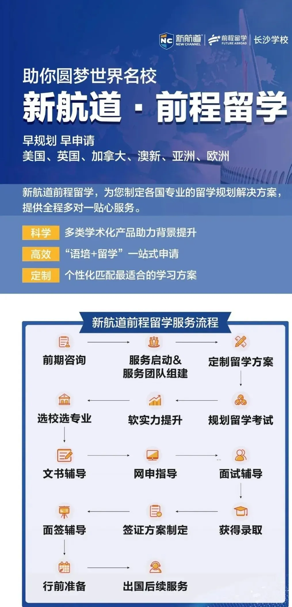 长沙新航道前程留学是新航道国际教育集团旗下品牌留学服务机构。提供包括美国、英国、加拿大、澳大利亚、新加坡、日本、韩国、中国香港/澳门等在内的多个地区留学咨询、留学职业规划、留学申请为主的留学服务。团队云集海内外学府、拥有丰富申请经验和海外求学经验的咨询顾问,深谙各国教育体制,课程设置以及院校详情和录取要求。针对学生个人特色,深度挖掘学生自身特长,结合学生个人爱好以及就业趋势,为学生量身打造专属留学规划解决方案,提供全程多对一高质量贴心服务。