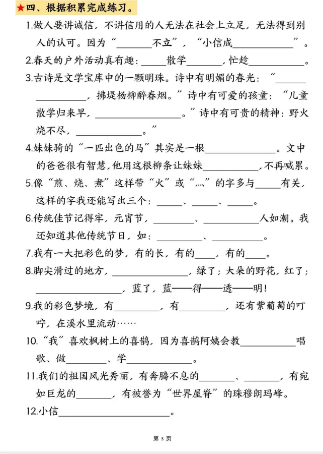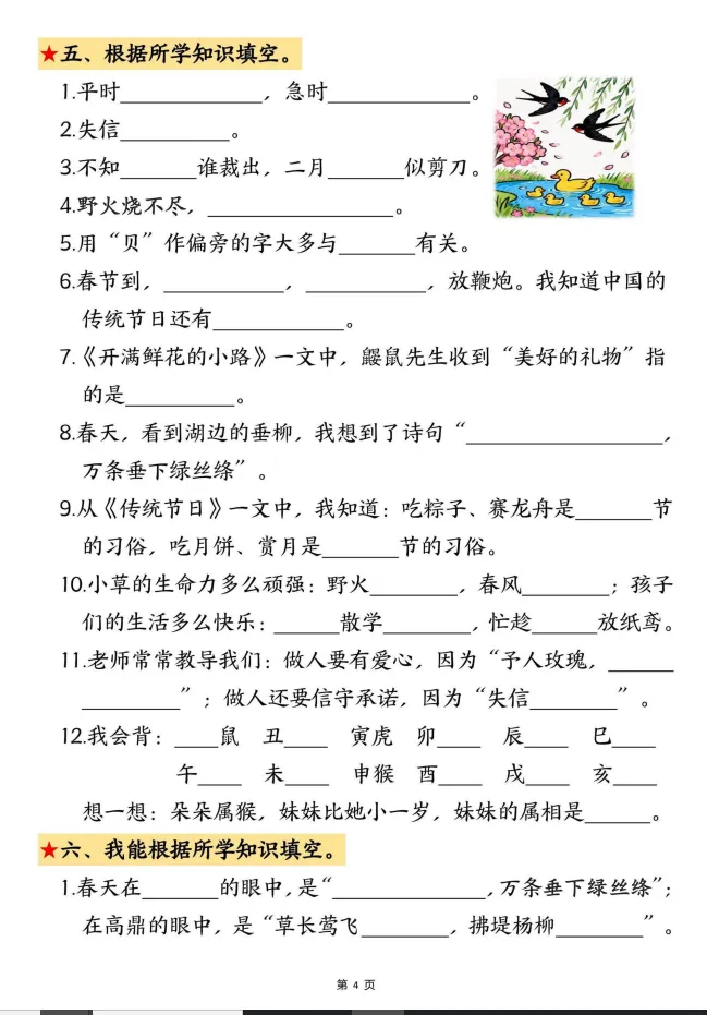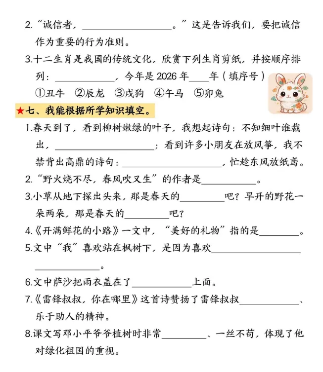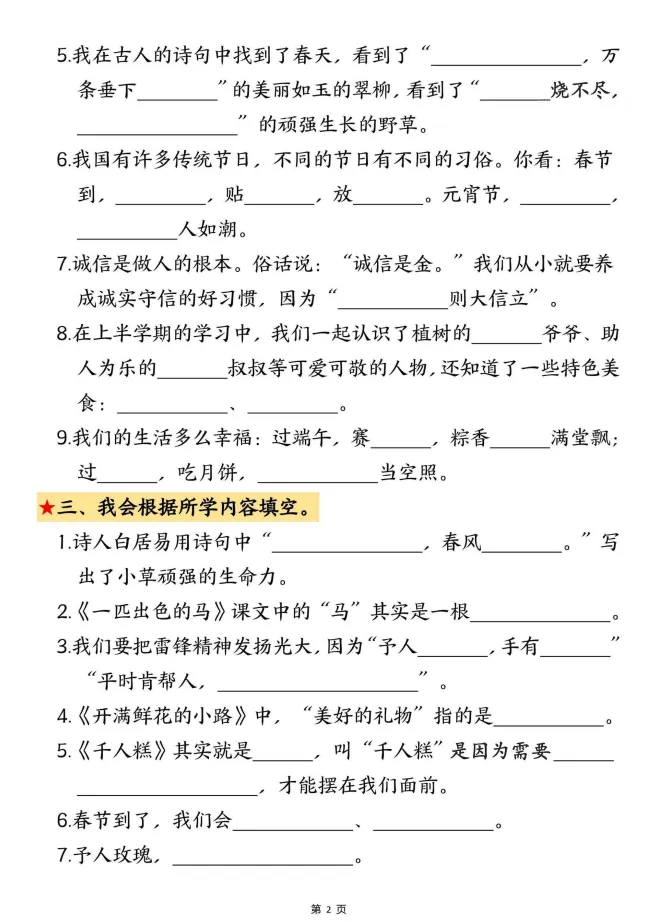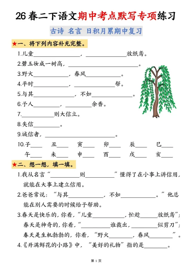 二下语文/《期中考点默写专项练习》(PDF可下载打印)