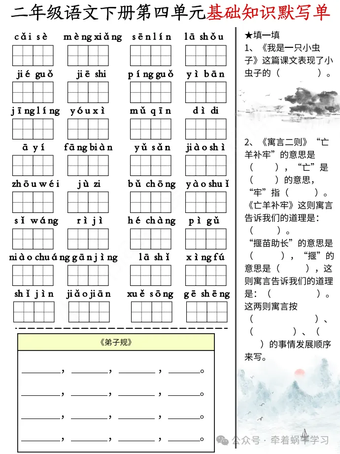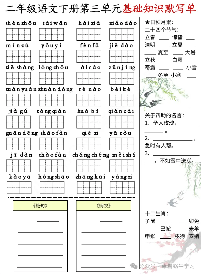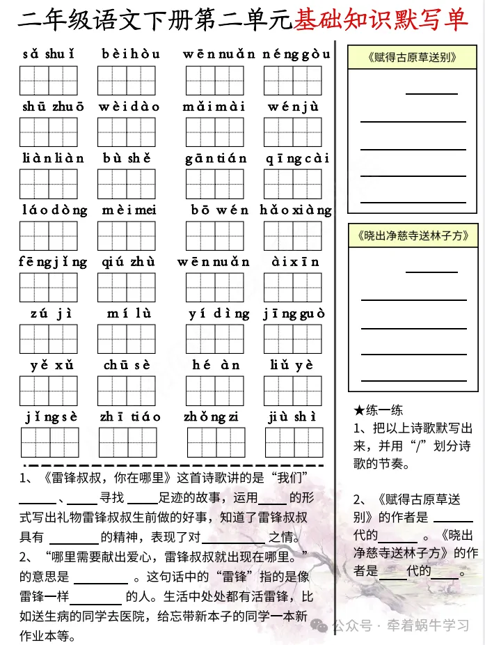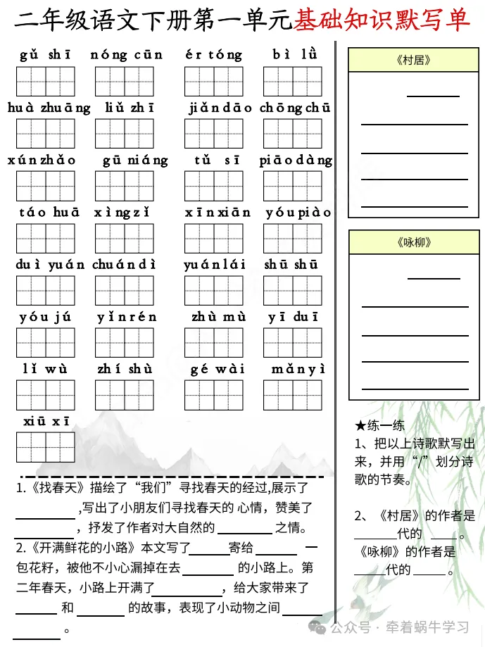 语文二年级下册《期中复习基础知识默写单》,共计4页。文末有完整电子版领取方式。