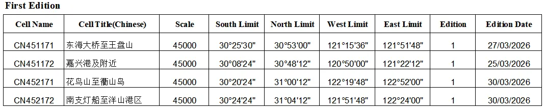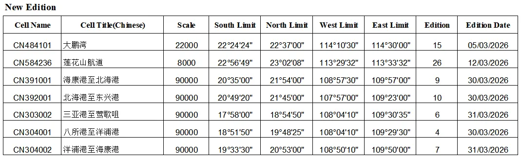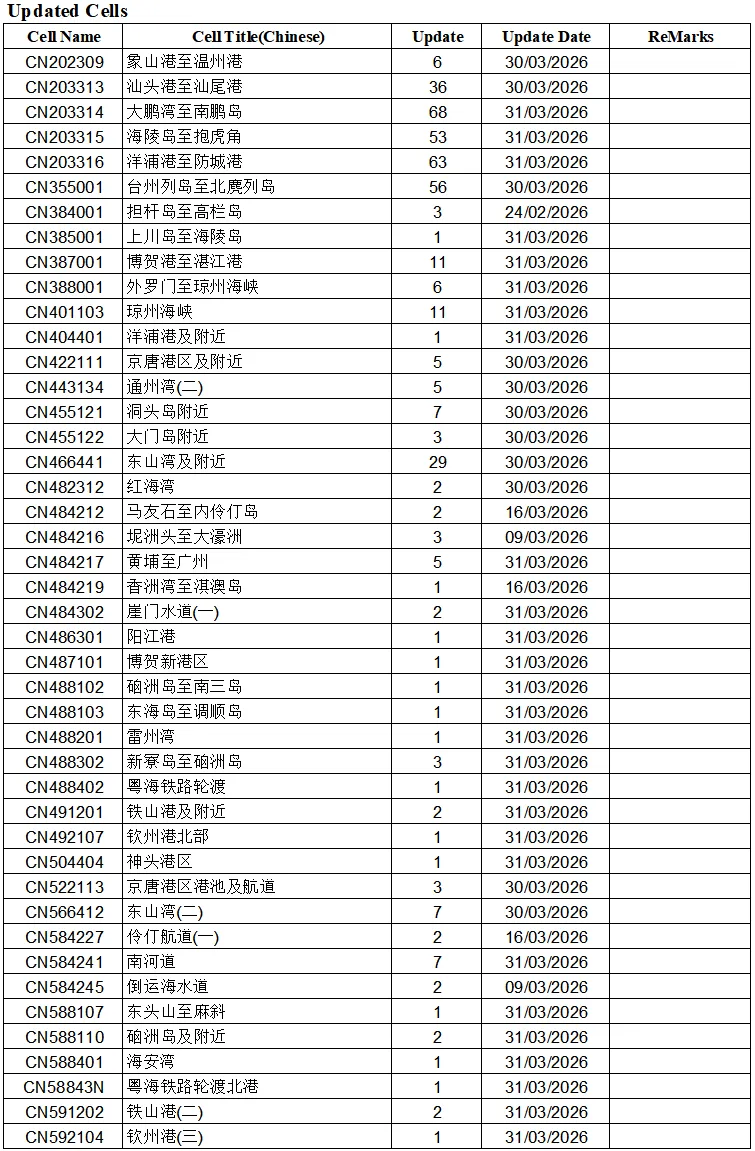 海事局电子海图数据更新说明 CN_WK14-26 海事版现已出版官方电子海图 557 幅,覆盖全国沿海所有航线和港口航道。官方电子海图每周更新一次。更新包括所有最新的改正通告内容和改版,新版电子海图。 舟山海图信息科技有限公司具有交通运输部东海航海保障中心上海海图中心一级代理授权,为用户每周提供最新的官方电子海图数据更新服务。 欢迎来电咨询,热线电话 18805800011 WK14-2026 数据更新列表