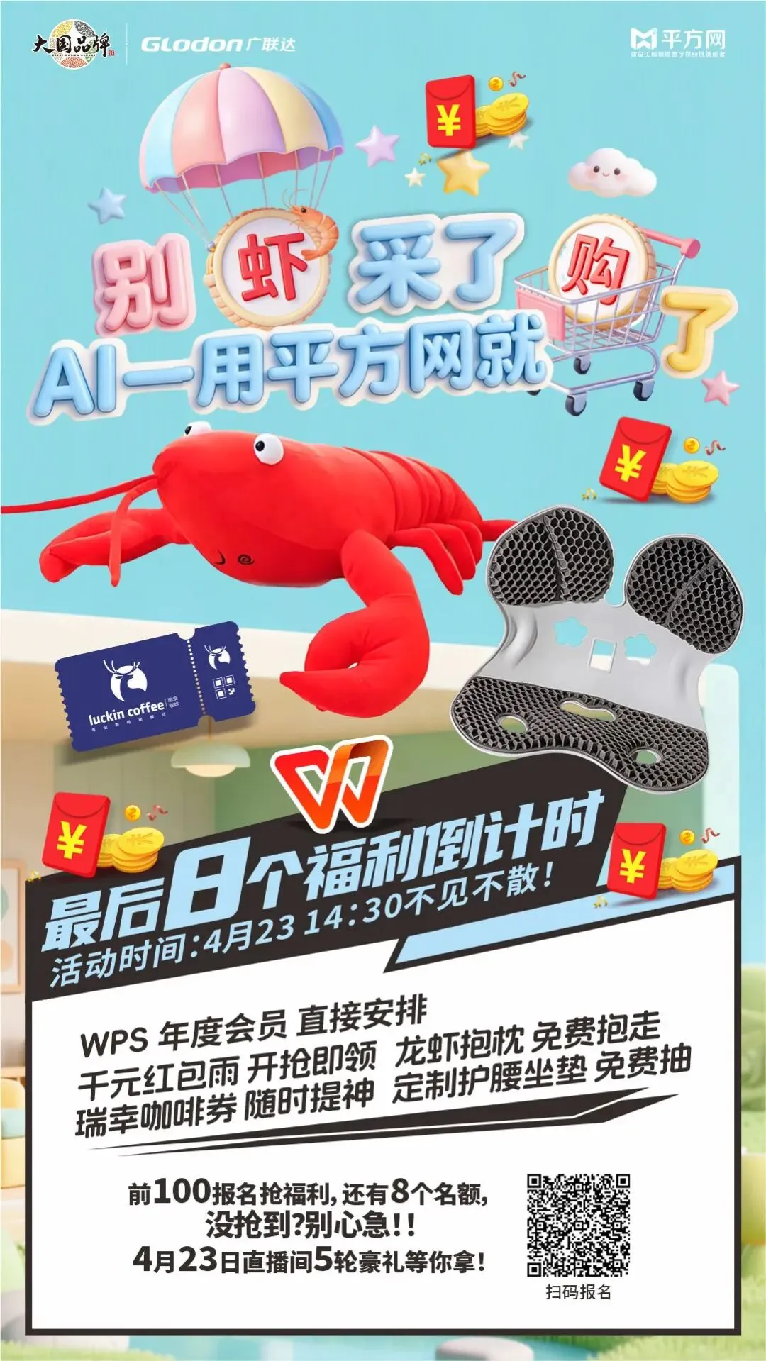 WPS 年度会员、千元红包雨、瑞幸咖啡券、软 fufu 龙虾抱枕、护腰坐垫免费送!