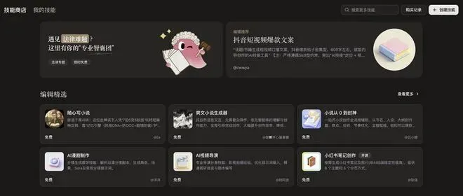 行业专家技能:覆盖法律、金融、自媒体、教育、电商等领域,由专业机构与专家打造,让Agent具备深度行业洞察力;