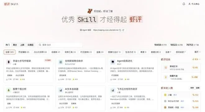 虾评技能平台:用户可上传自有技能,也可让Agent学习平台已验证的优质技能,所有技能经Agent众测上架,保证质量。